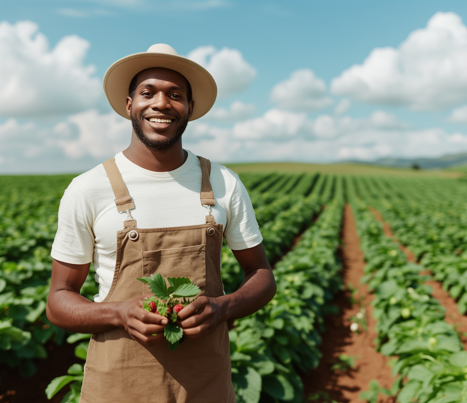 Smiling farmer in a strawberry field holding fresh strawberries, wearing a beige hat and overalls under a bright blue sky.