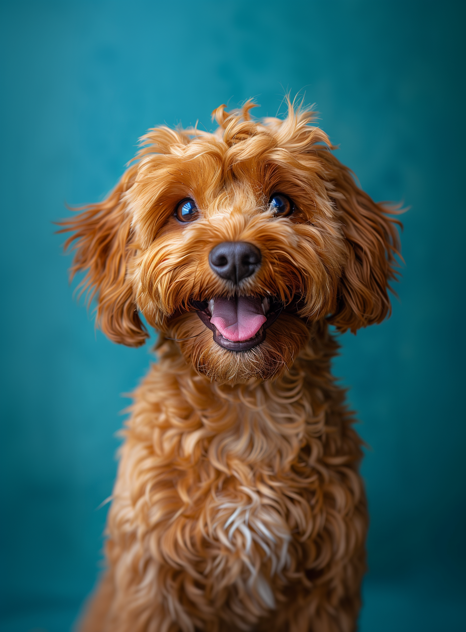 Adorable golden-brown dog with curly fur and a joyful expression against a teal background.