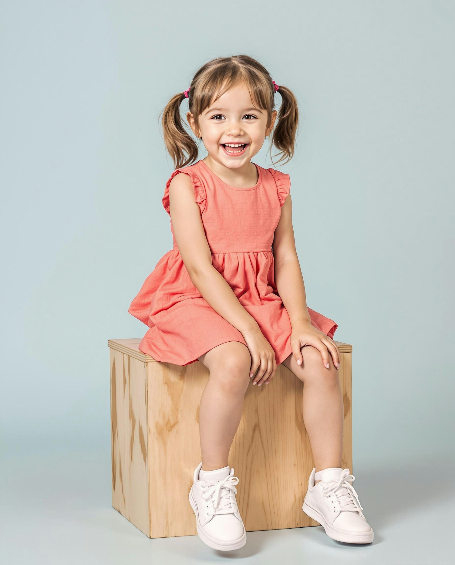 Adorable young girl in a coral pink dress and white sneakers, sitting on a wooden box with a cheerful smile against a light blue background.