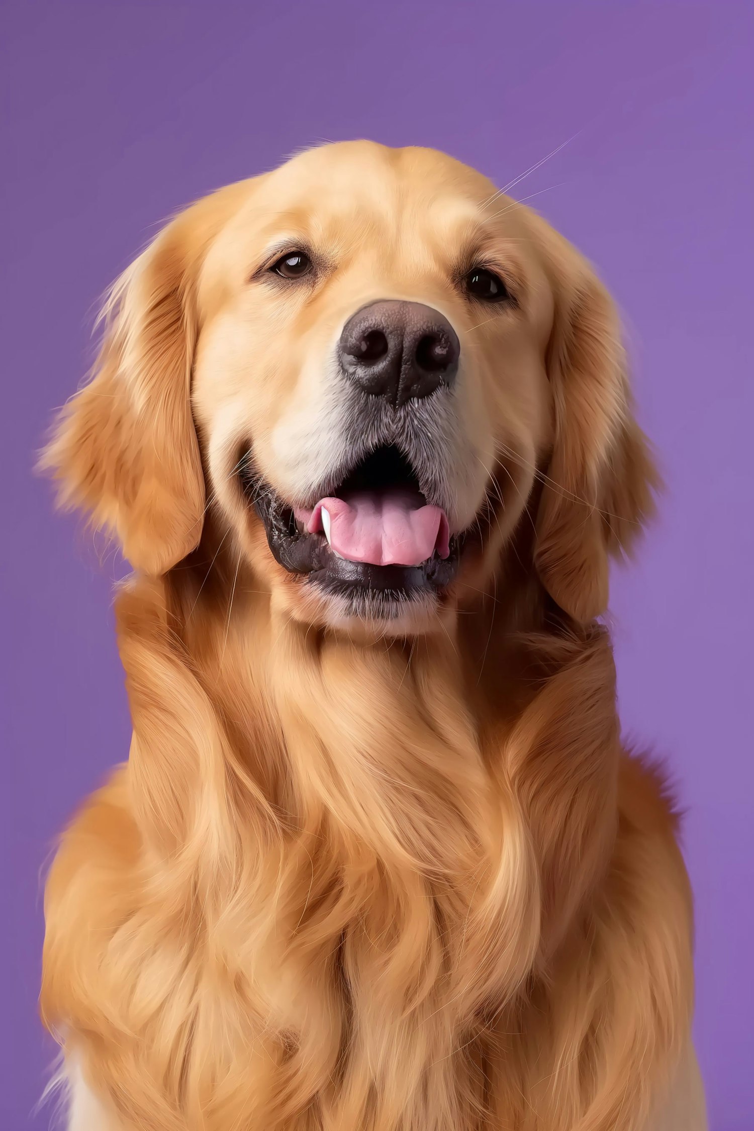Golden retriever with shiny fur against a purple background, showcasing its friendly expression and well-groomed appearance.