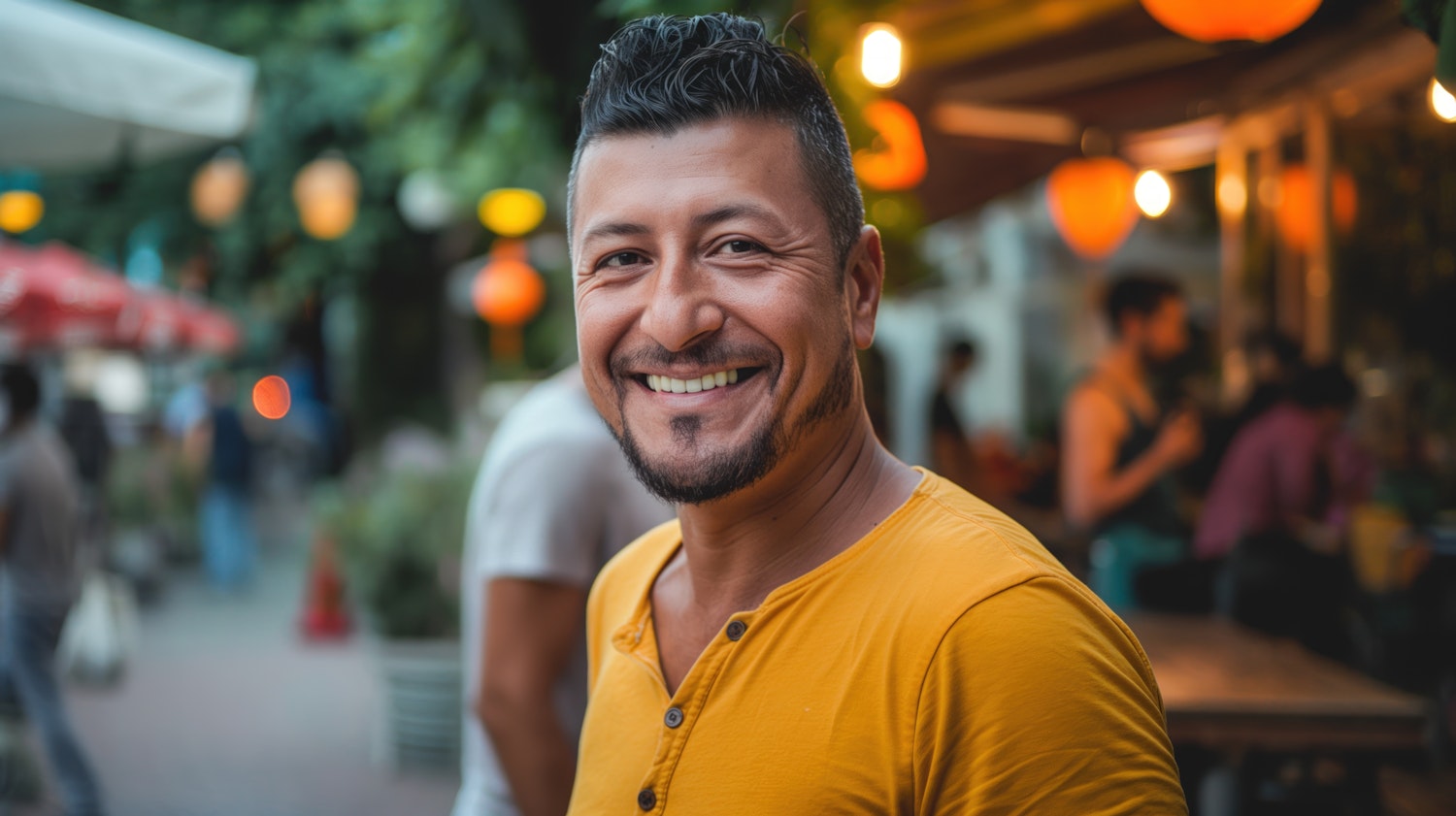 Smiling man in a yellow shirt outdoors, with a lively street scene and colorful lights in the background.