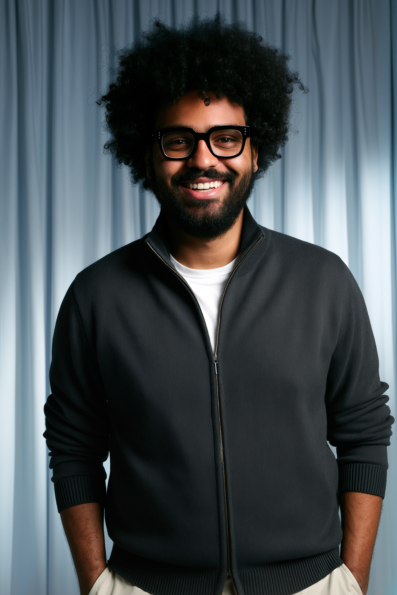 A smiling man with curly hair and glasses, wearing a dark sweater and white shirt, stands against a light blue draped background.