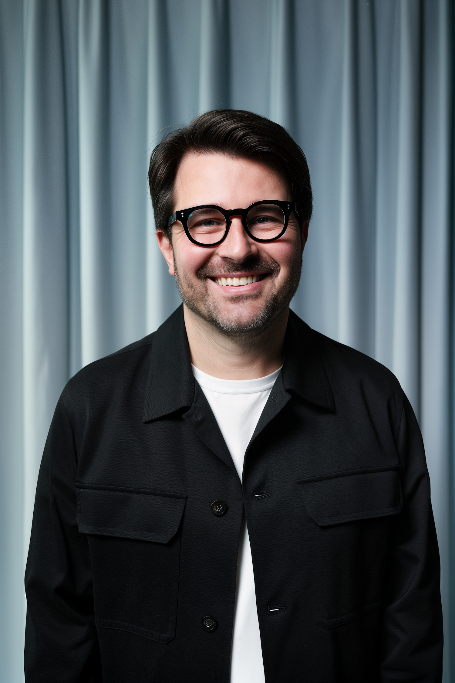 A smiling man with glasses and a black jacket stands against a light blue curtain background, exuding a friendly and professional vibe.