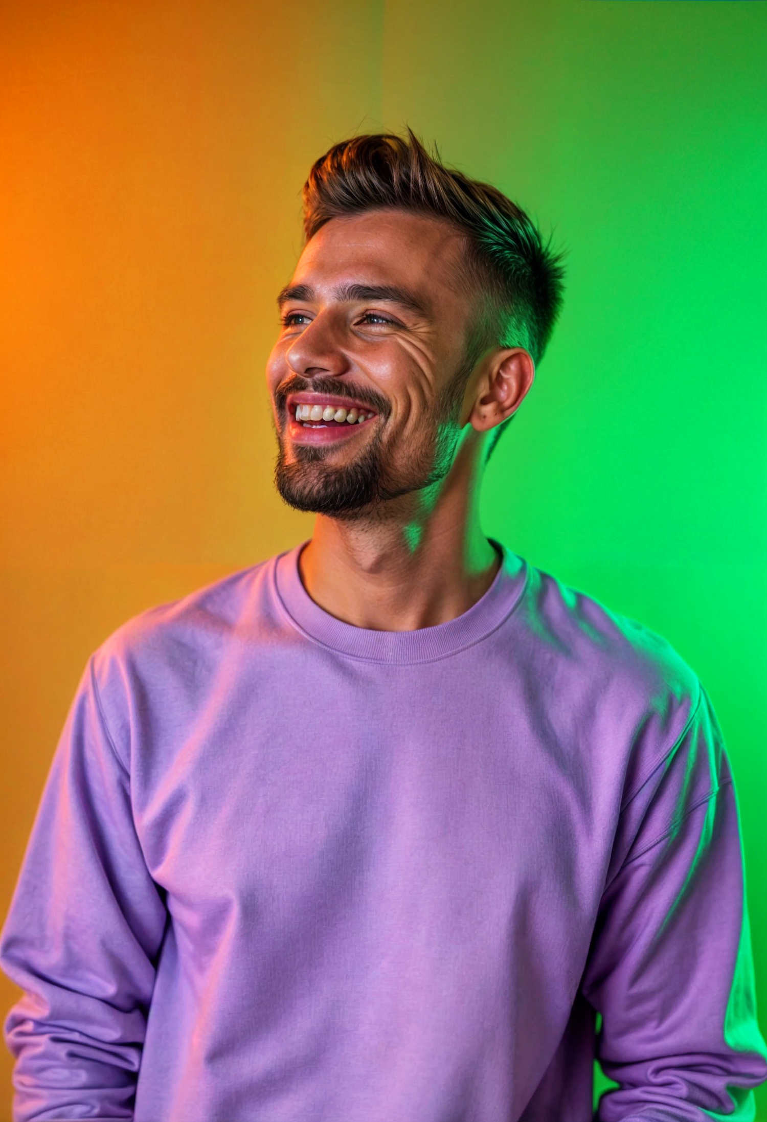 Smiling man in a purple sweatshirt against a vibrant orange and green background, exuding joy and warmth.