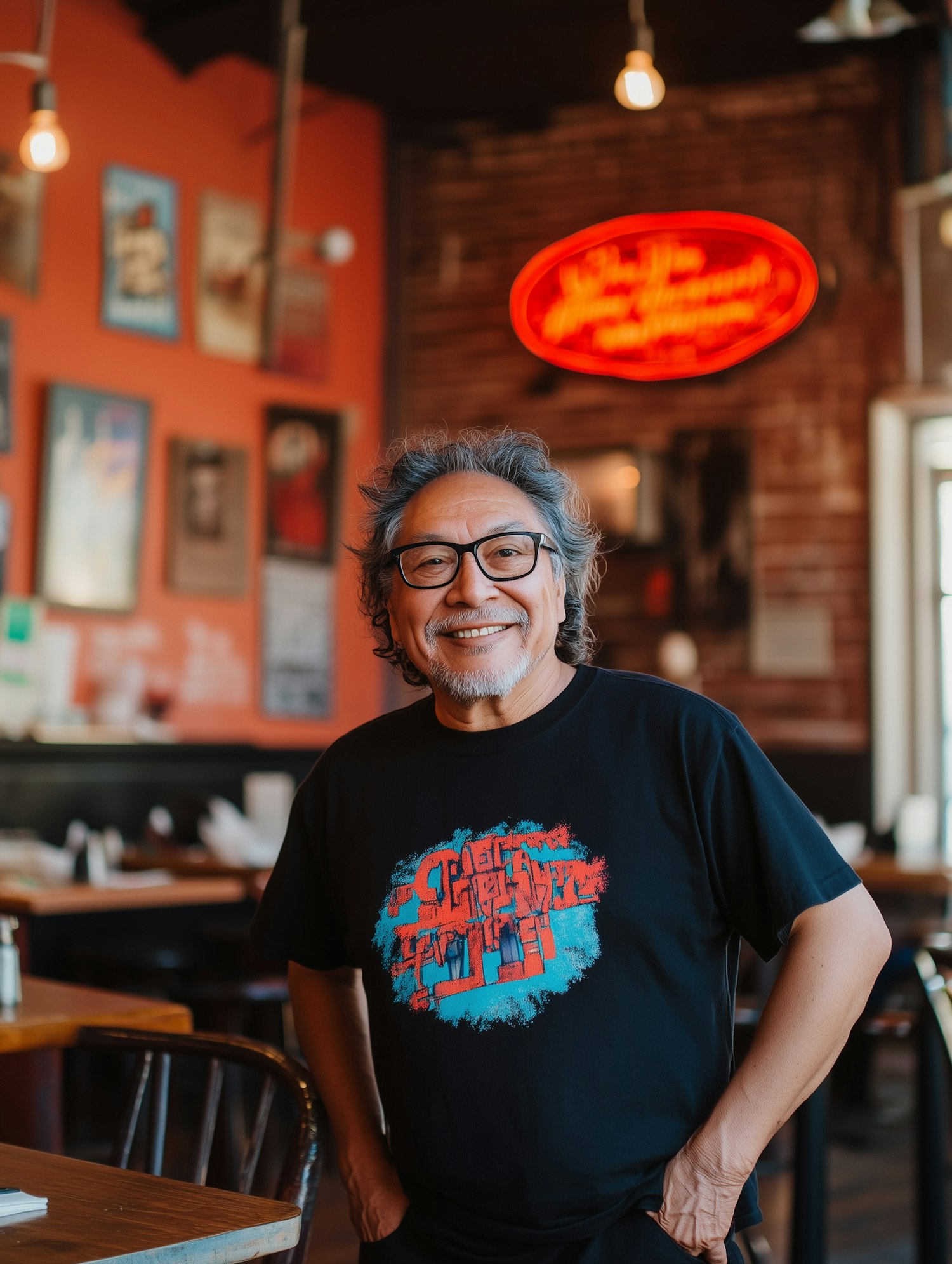 Smiling older Asian man in a black T-shirt with colorful design, standing in a cozy restaurant with warm lighting and a neon sign.