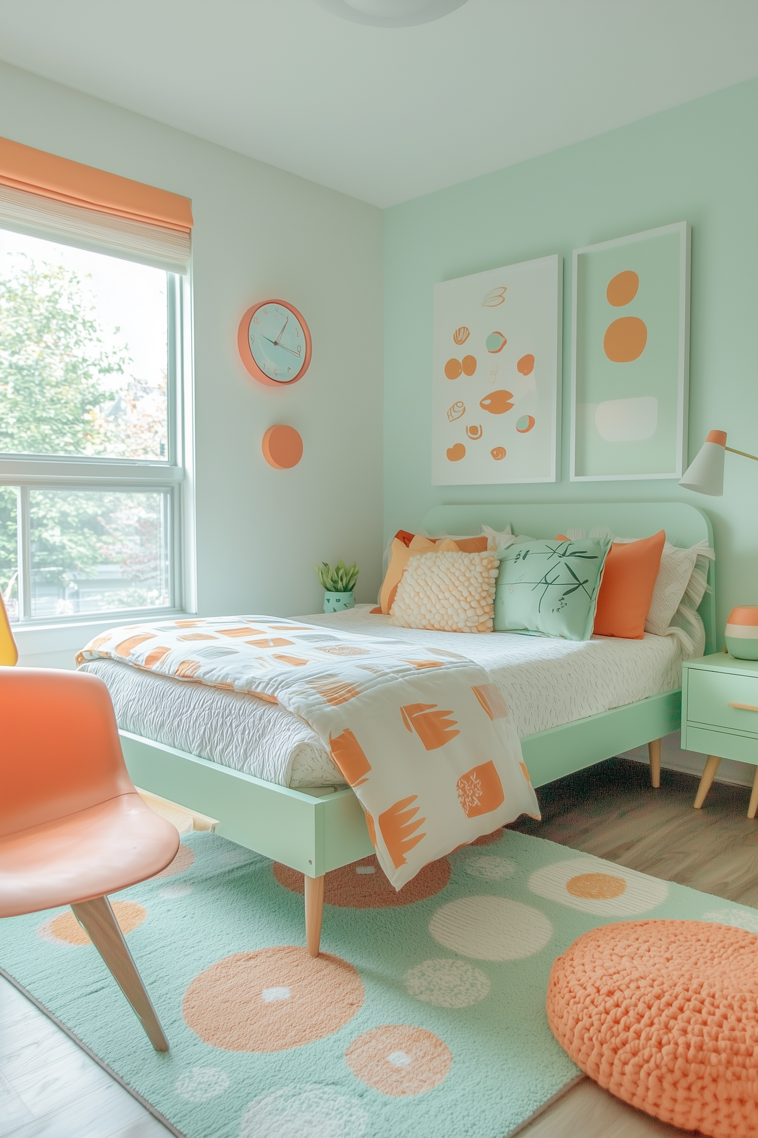 Bright bedroom with mint green and orange decor, featuring a cozy bed, patterned rug, and minimalist wall art. Perfect for a cheerful vibe.