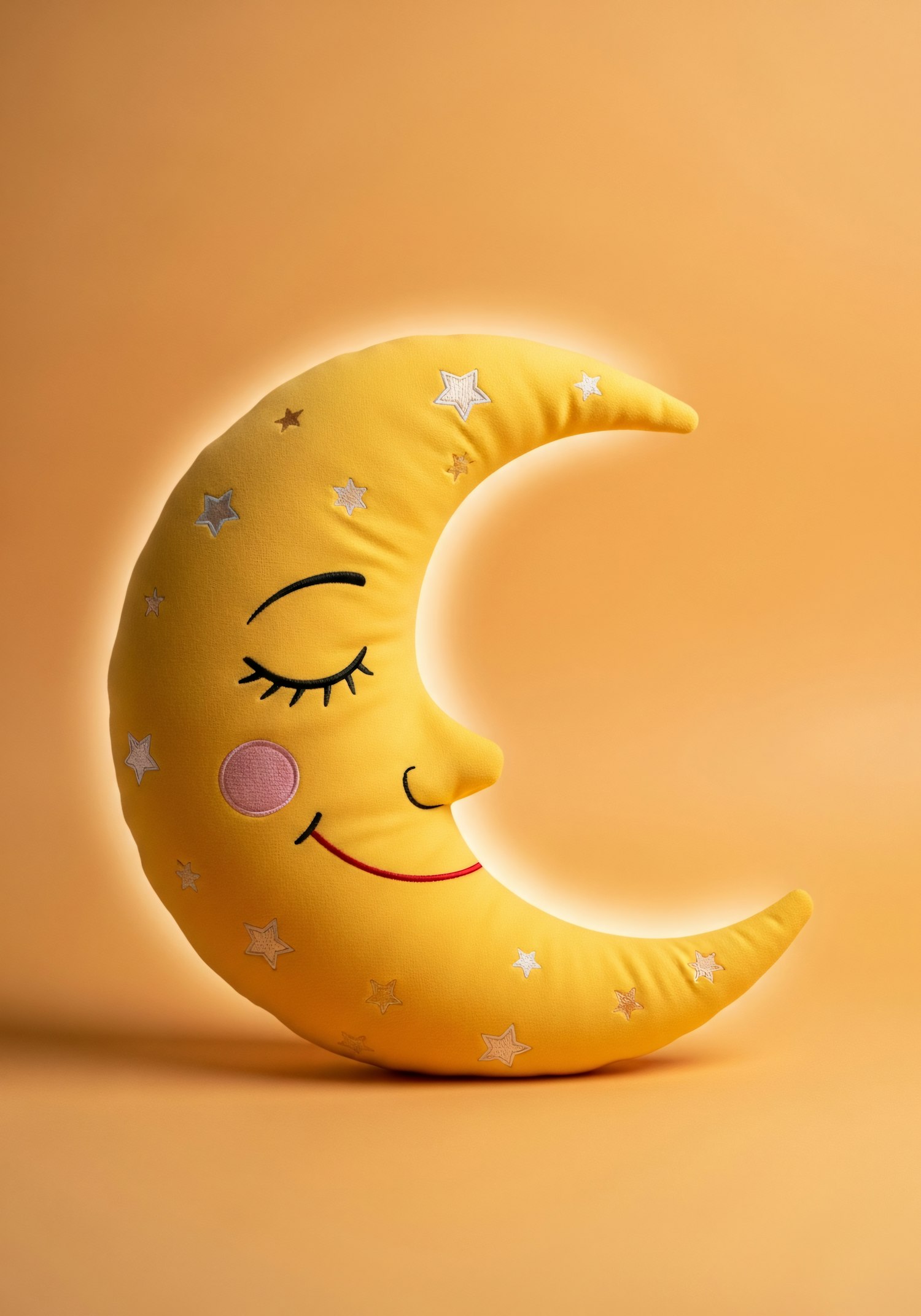 A crescent moon-shaped plush pillow with a smiling face and star embroidery, set against a warm orange background.