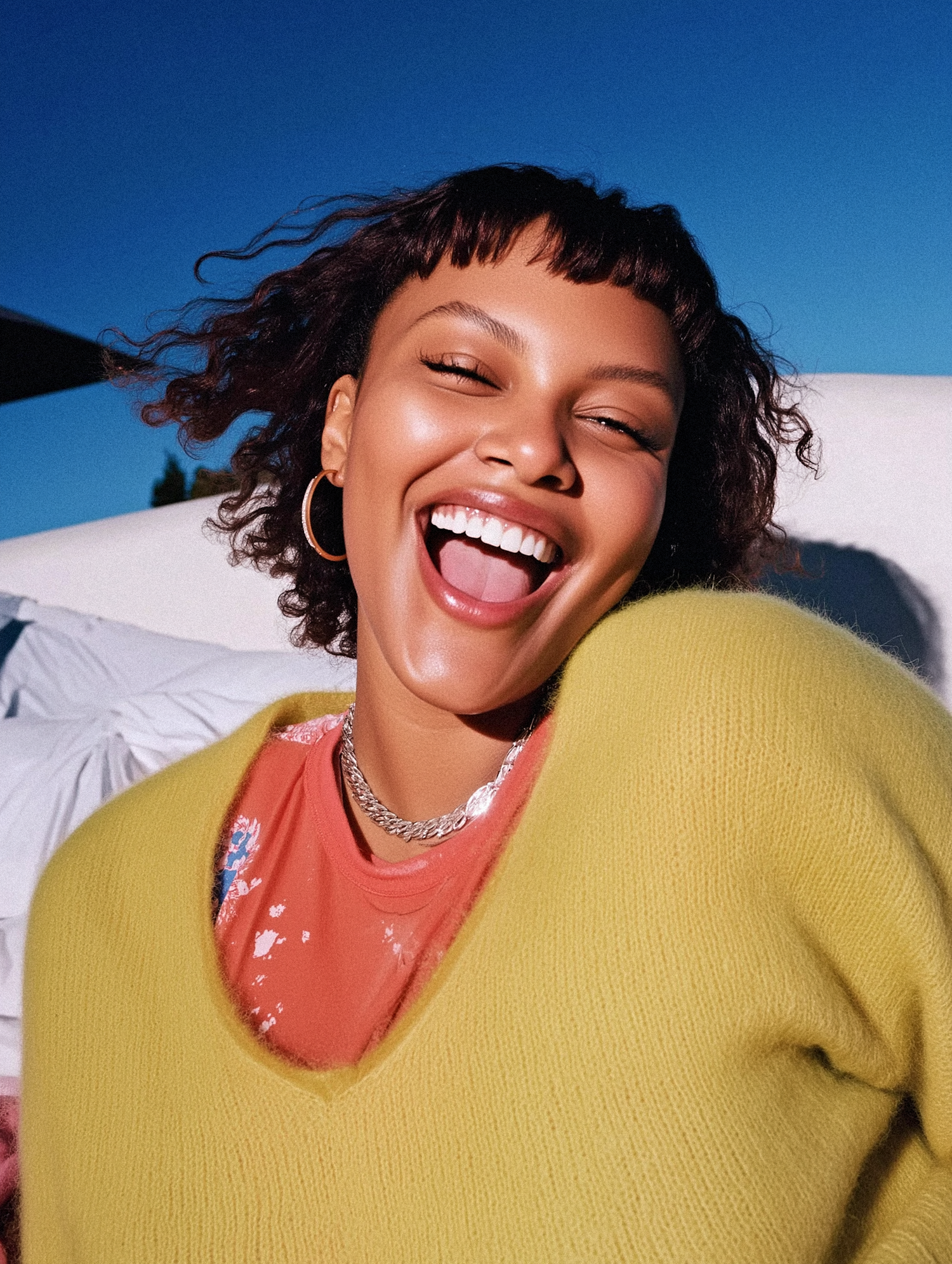 A joyful person in a yellow sweater smiles brightly against a clear blue sky, radiating happiness and energy in this vibrant outdoor shot.