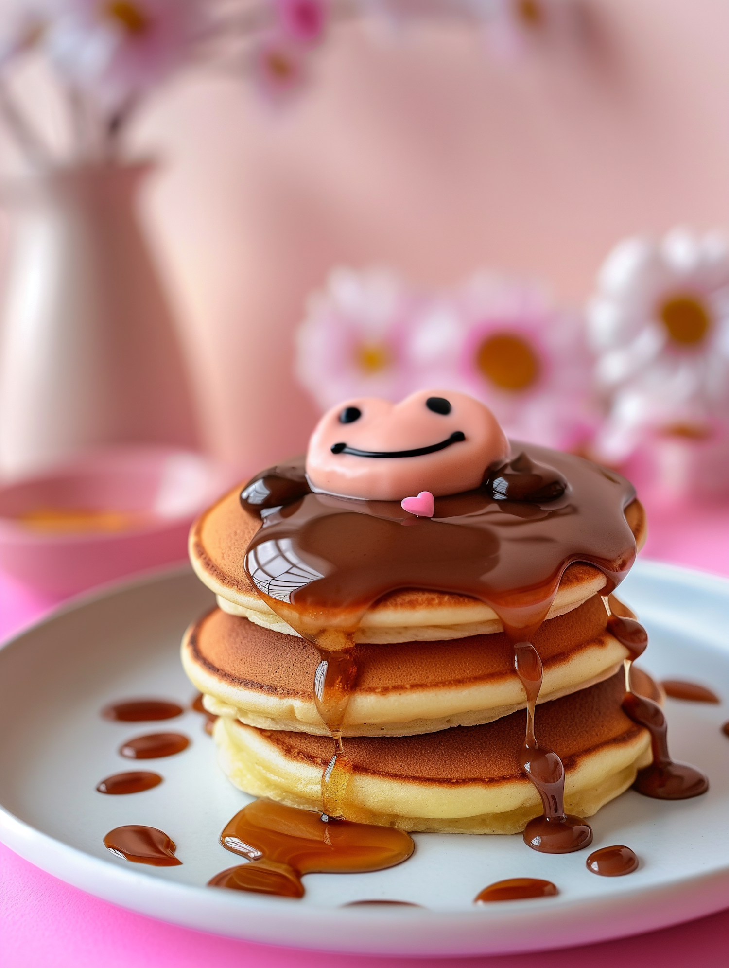 Stack of fluffy pancakes with syrup and a cute smiley face topper, set against a floral pink background.