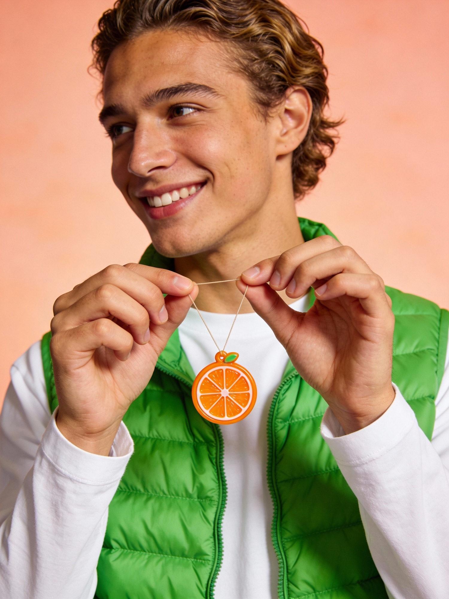 A cheerful young man in a green vest holds an orange slice pendant, set against a warm peach background.