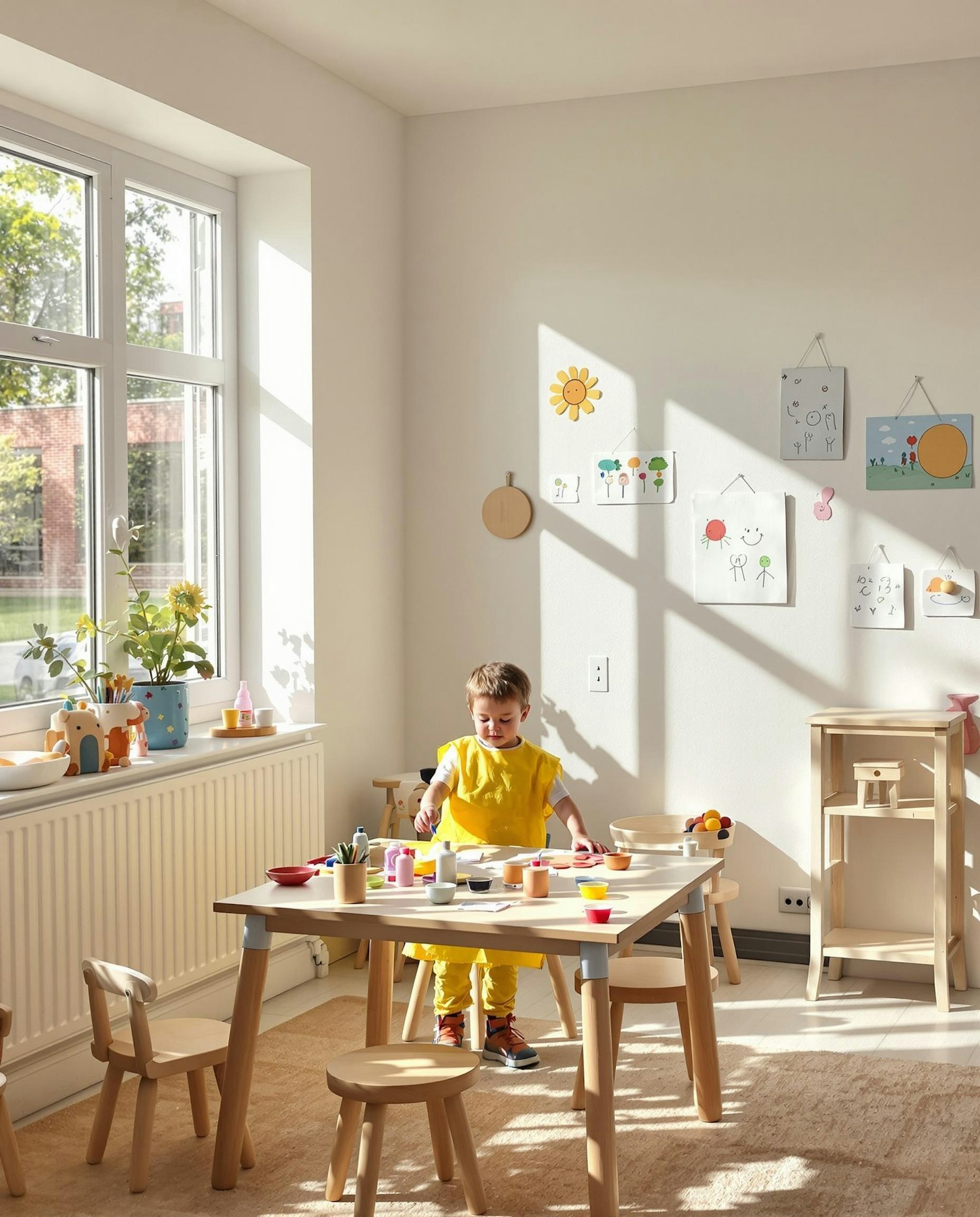 A sunny playroom with a child painting at a wooden table, surrounded by colorful art supplies, kids' drawings, and cozy wooden furniture.