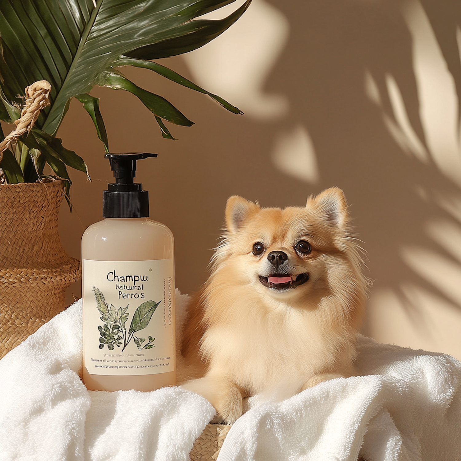 Adorable Pomeranian with natural dog shampoo on a cozy towel, surrounded by warm lighting and earthy decor. Perfect for pet care lovers!