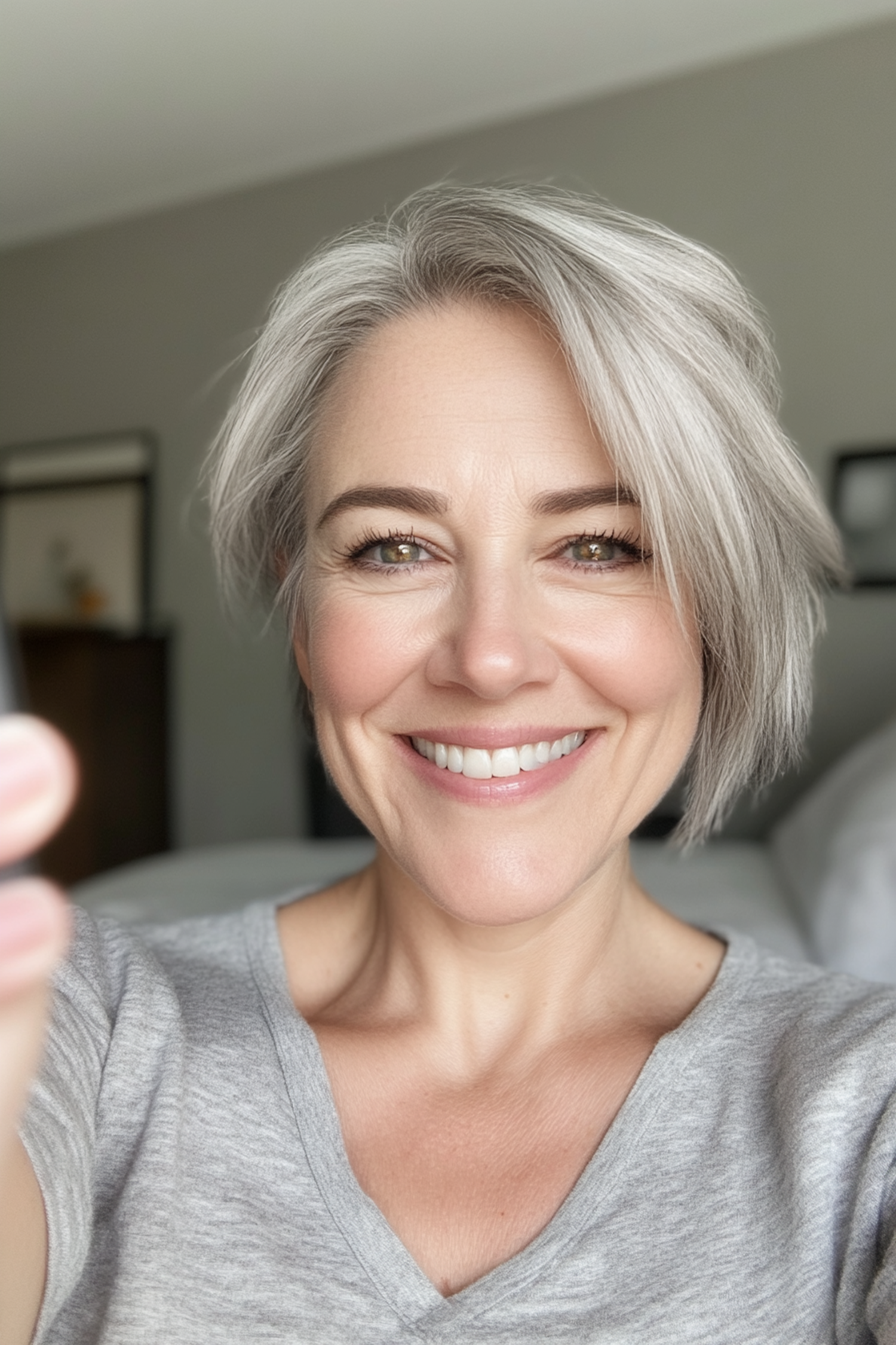 Smiling woman with short silver hair and light brown eyes, wearing a gray V-neck shirt. Soft natural lighting enhances her cheerful expression.