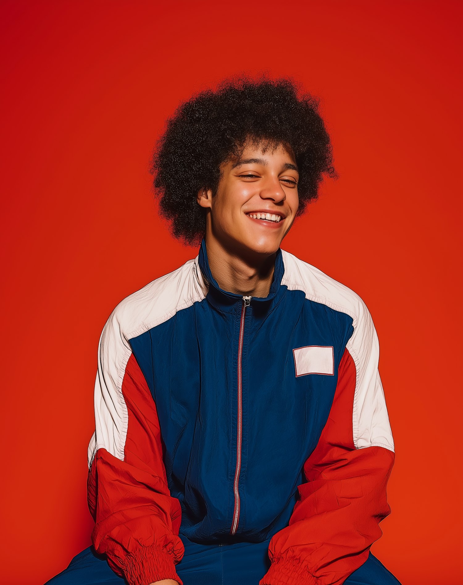 A cheerful person in a colorful tracksuit smiles warmly against a vibrant red background, radiating positivity and energy.