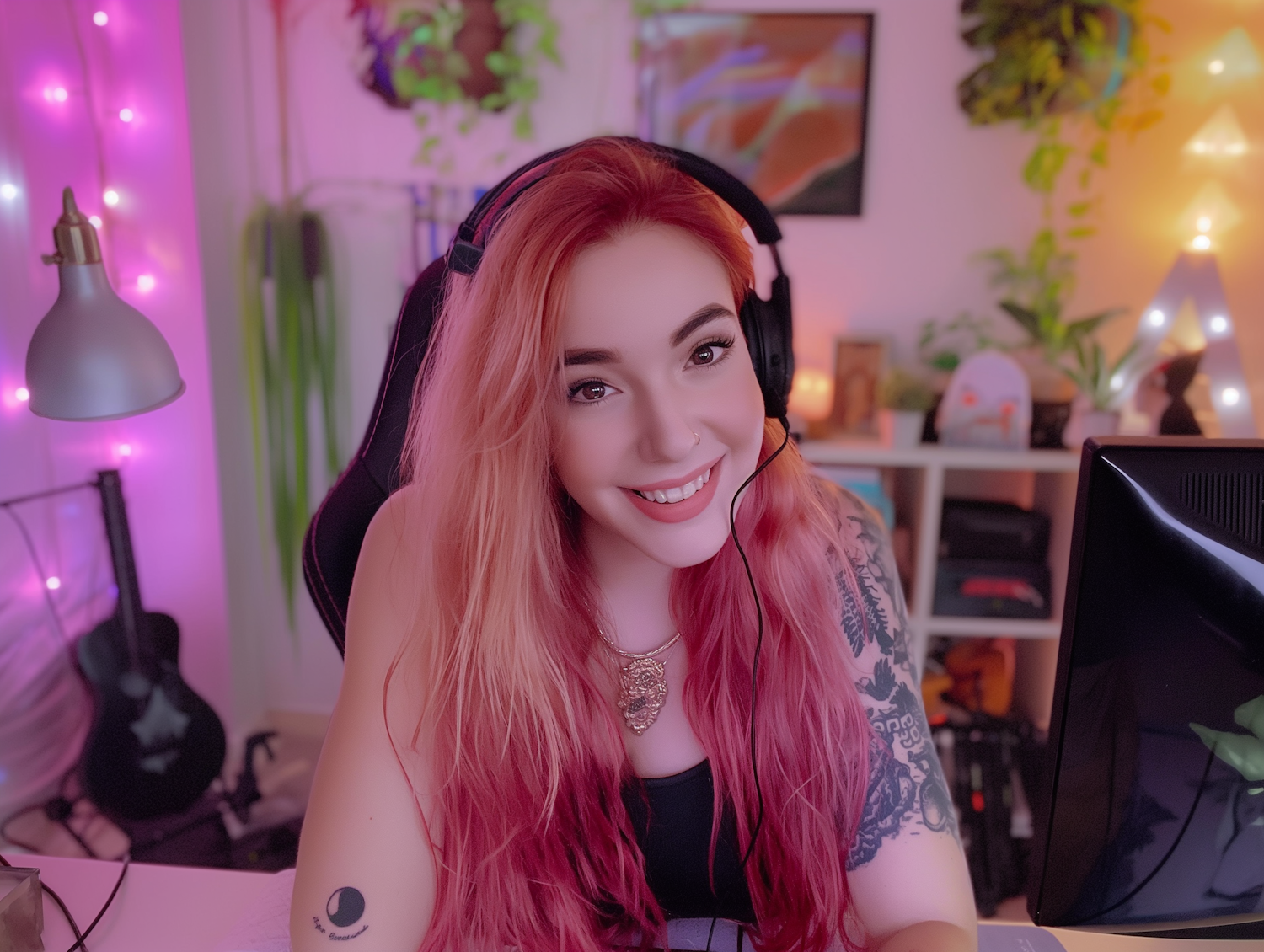 Smiling woman with pink hair and tattoos, wearing a headset in a cozy room with pink lights and plants.