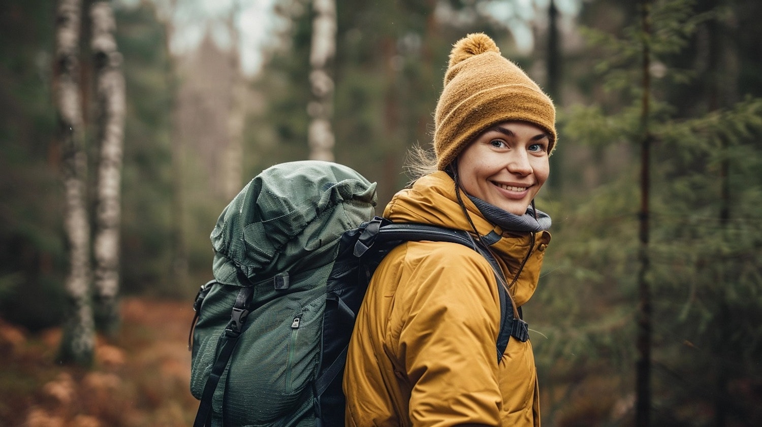 Smiling woman in a yellow jacket and beanie hiking in a forest with a green backpack, surrounded by tall trees.