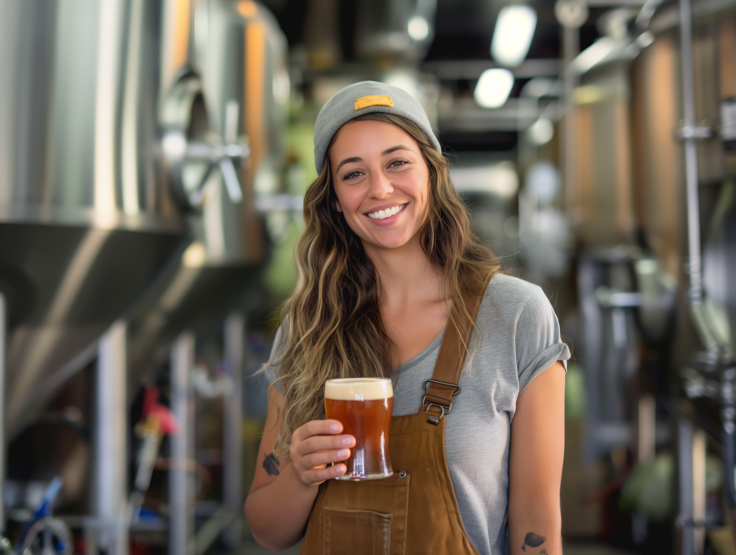 Smiling woman in a brewery holding a pint of beer, wearing a beanie and overalls, surrounded by brewing tanks.