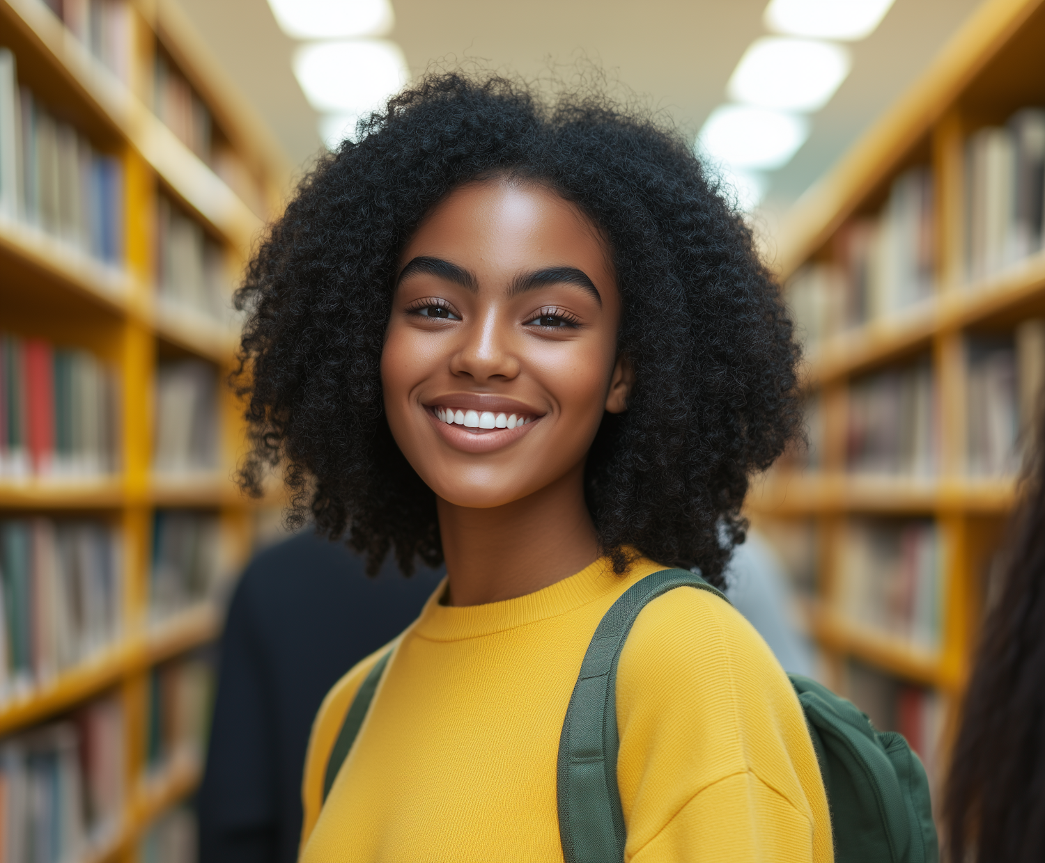 Smiling young woman in a yellow sweater with curly hair in a library, surrounded by bookshelves, exuding warmth and positivity.