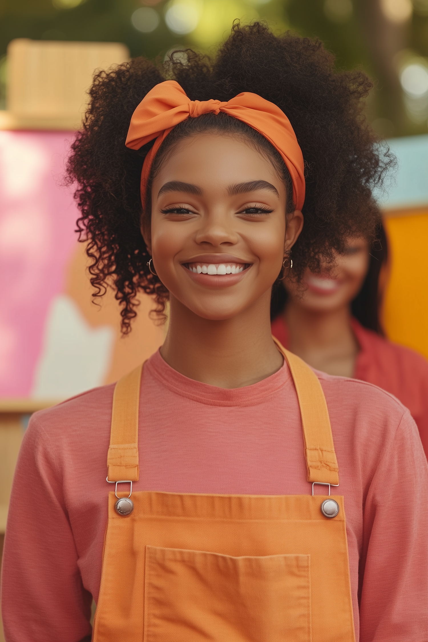 Smiling young woman in orange overalls and headband, exuding joy and confidence in a colorful setting.
