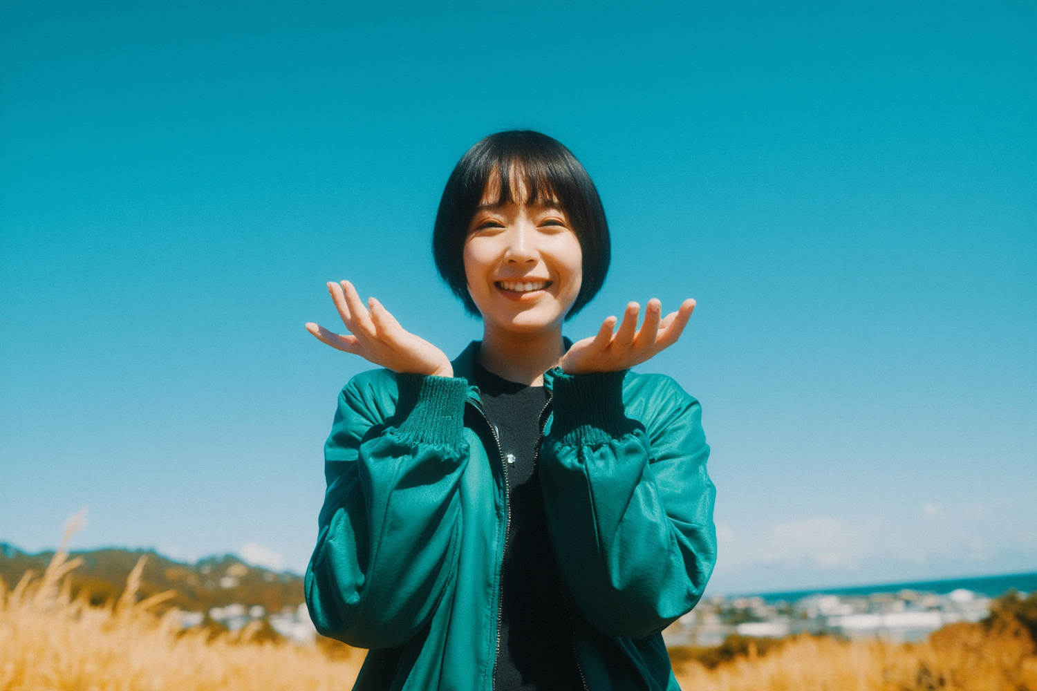 Smiling woman in a teal jacket outdoors under a bright blue sky, with golden fields and distant hills in the background.