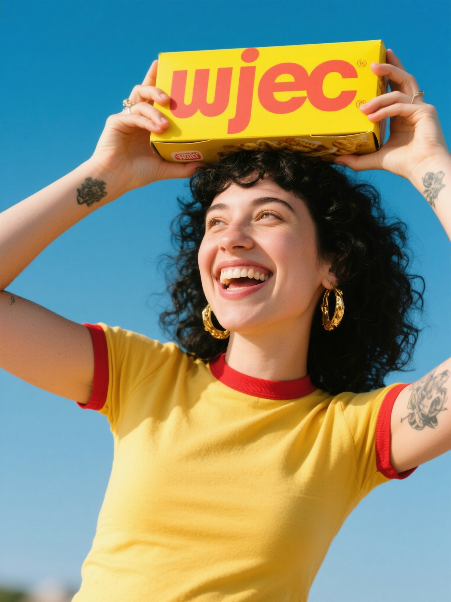 sunny lifestyle photo, candid moment, strong natural lighting, clear shadows, vibrant colors, soft textures, shallow depth of field, casual framing, summer energy, editorial feel, a smiling woman with curly black hair, gold earrings and visible tattoos, holding a bright yellow snack box with bold typography above her head, wearing a vintage yellow t-shirt with red trim, clear blue sky in the background, joyful expression and vibrant color harmony, no visible logos