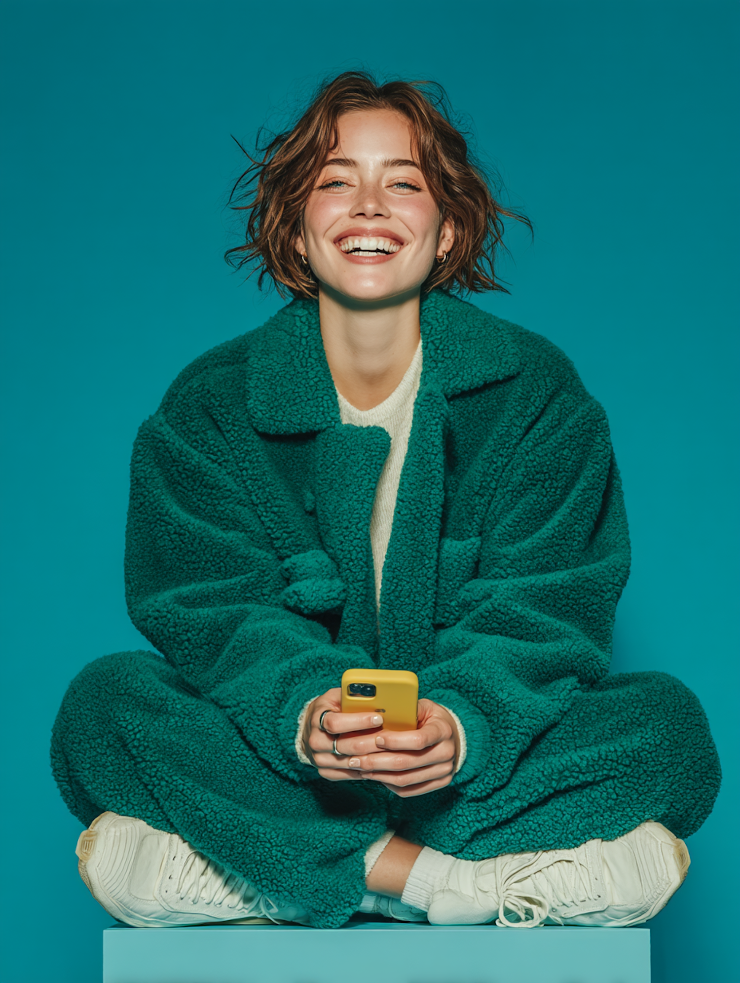 A cheerful woman in a teal fleece coat, holding a yellow phone, sits cross-legged against a vibrant teal background.