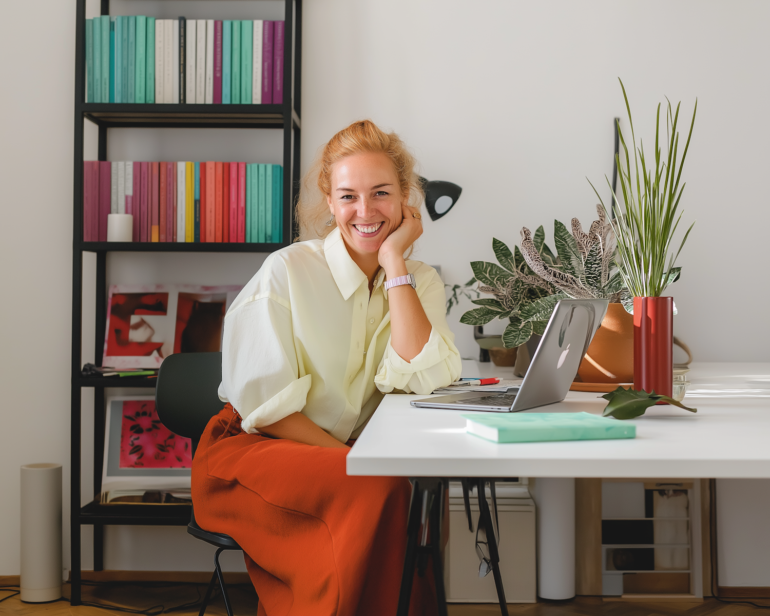 Bright workspace with a smiling woman, colorful books, potted plants, and a laptop on a white desk. Perfect mix of productivity and style.