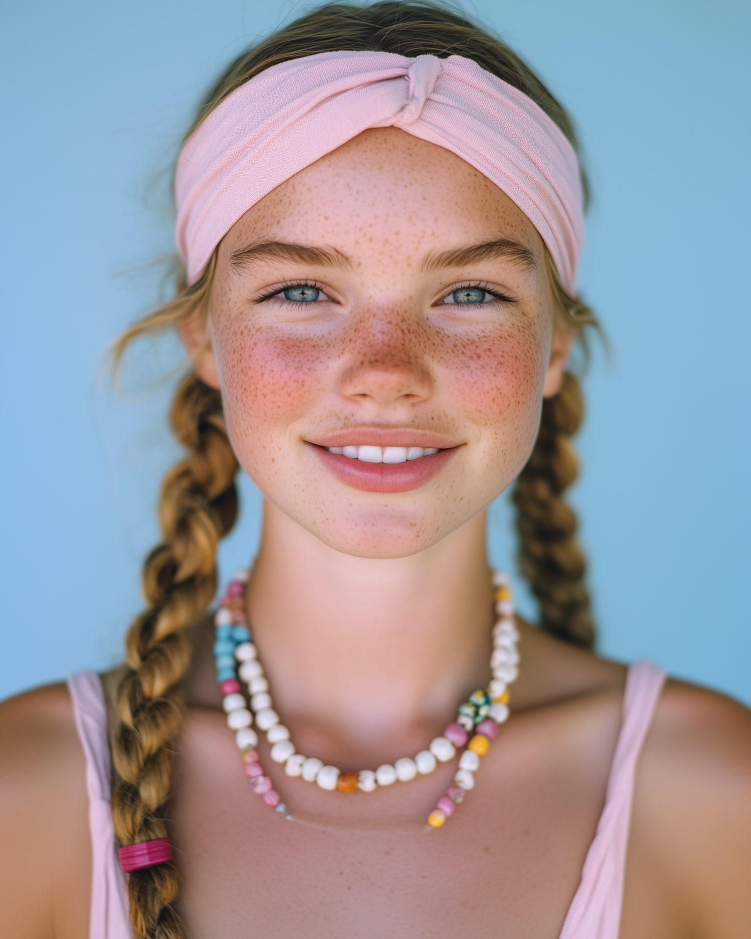 Smiling girl with freckles and braids, wearing a pink headband and colorful necklaces against a blue background.