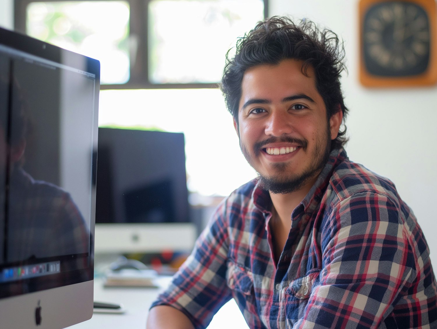 Smiling young man with curly hair and beard in a plaid shirt, sitting at a desk with a computer in a bright office.