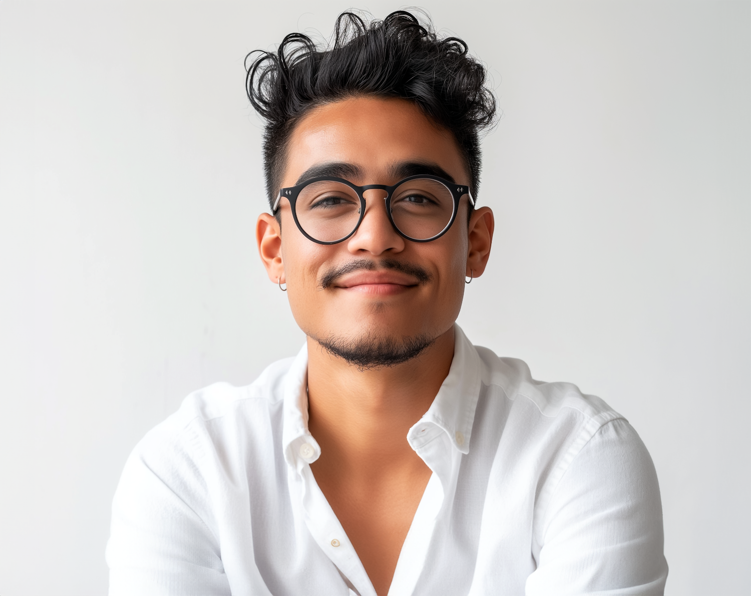 Young man with glasses and curly hair, wearing a white shirt, smiling confidently against a light gray background.