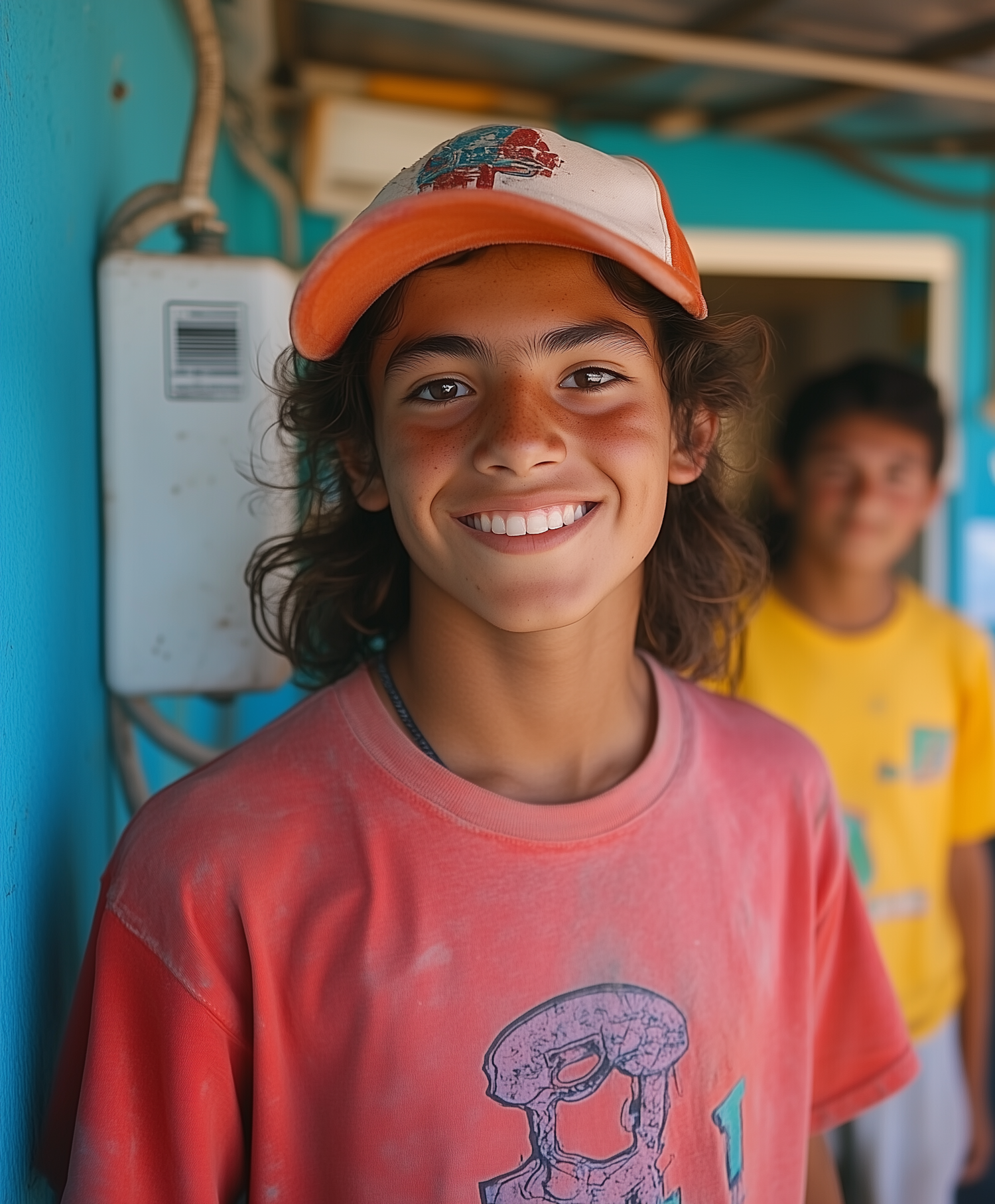 Smiling boy in a red shirt and cap stands in front of a turquoise wall, exuding a cheerful vibe. Another boy in yellow is in the background.