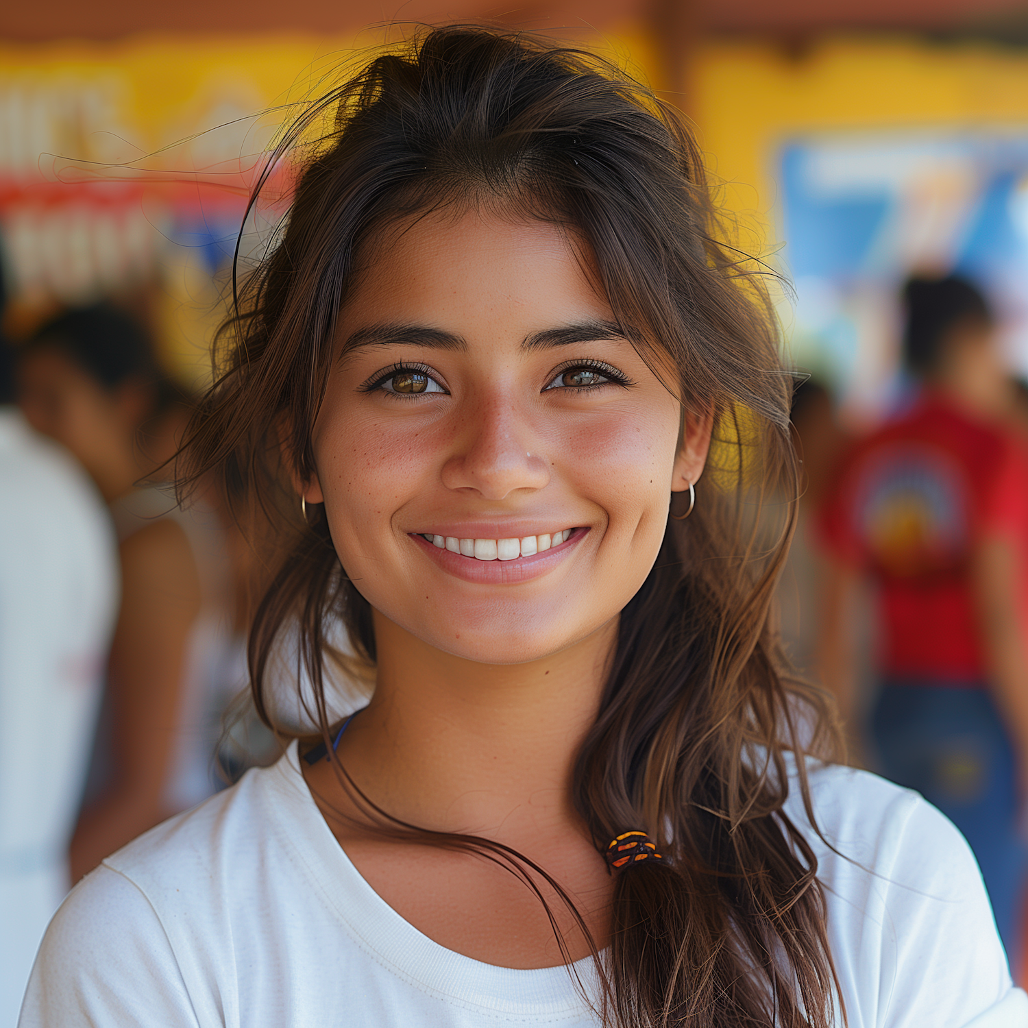 Smiling young woman with dark hair and brown eyes in a lively, colorful setting. She wears a white t-shirt and hoop earrings.