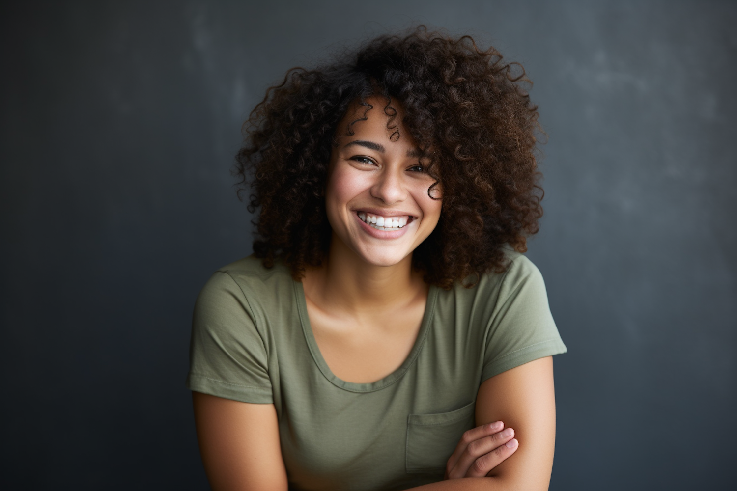 Smiling woman with curly hair in an olive green shirt against a dark background, exuding warmth and positivity.