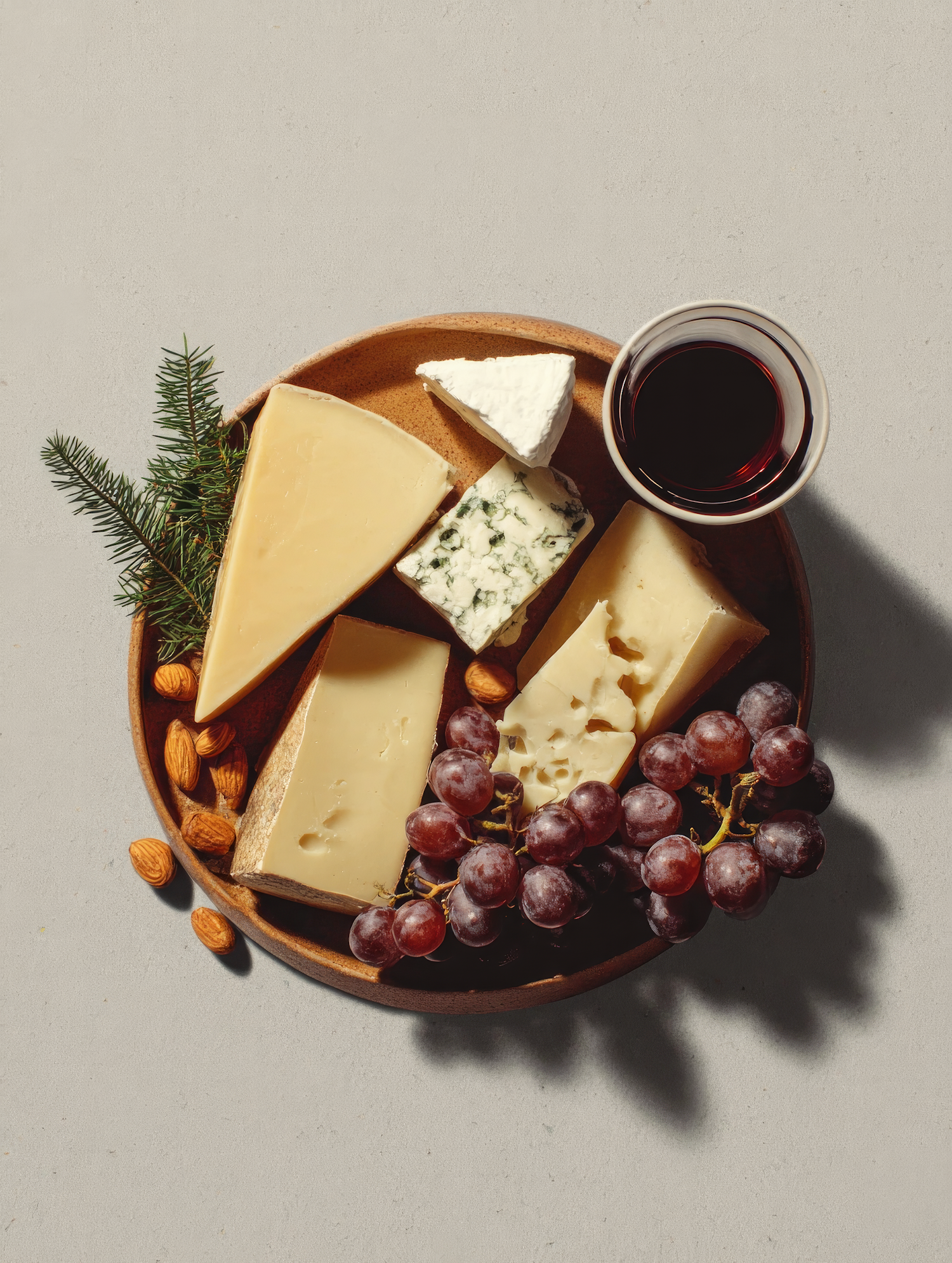 A wooden plate with assorted cheeses, red grapes, almonds, and a glass of red wine on a neutral background.
