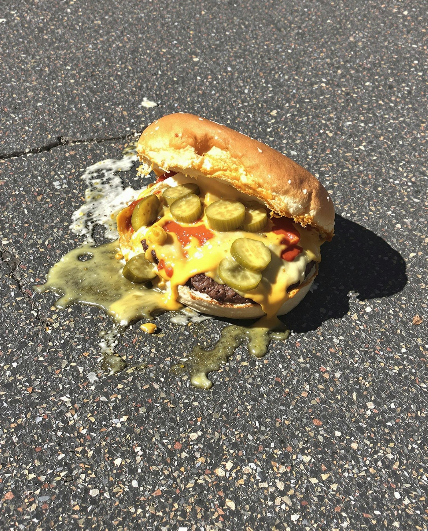 A close-up of a cheeseburger spilled on an asphalt road, with cheese, pickles, and ketchup messily spread out.