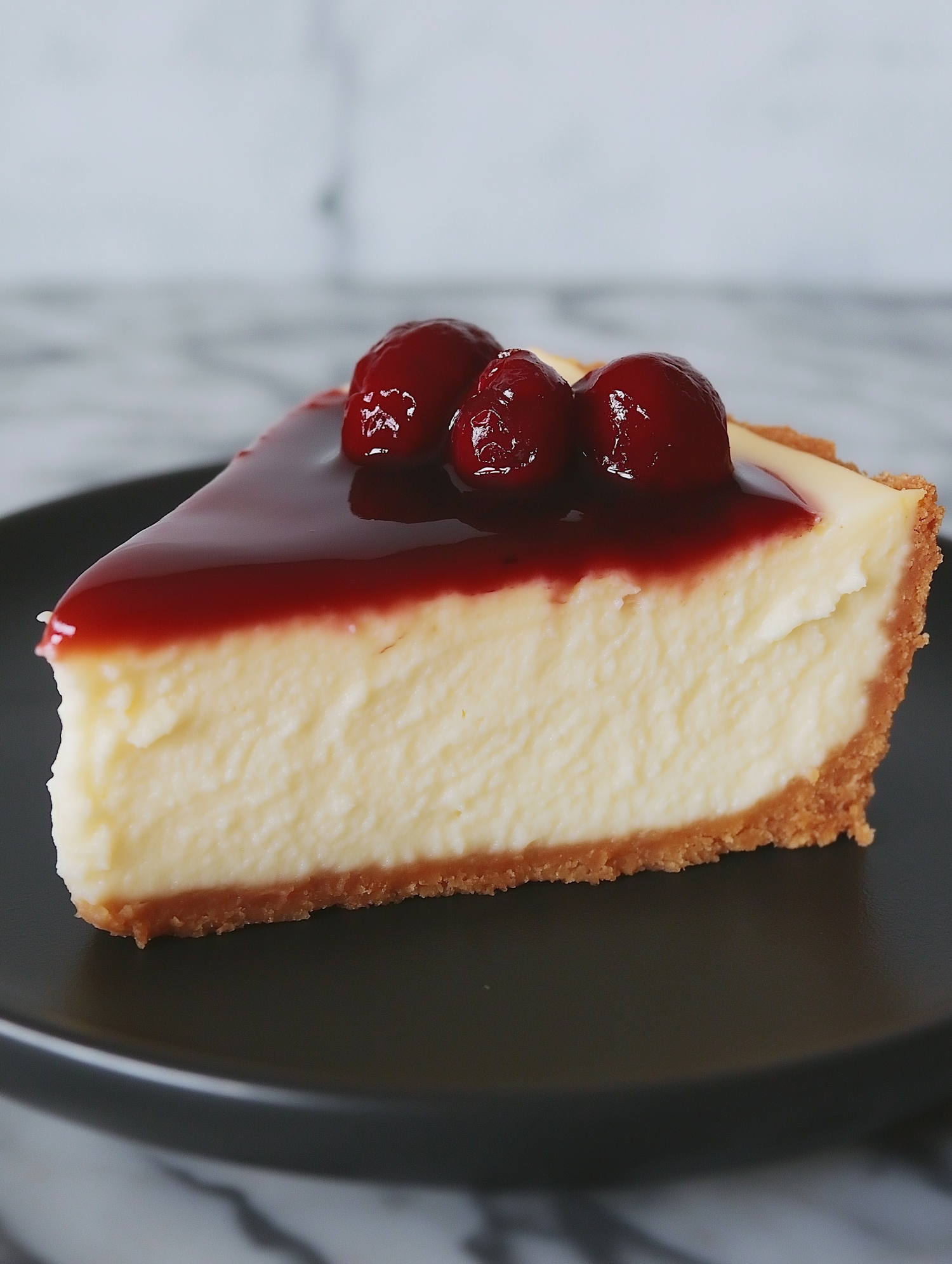 Delicious slice of cheesecake with a cherry topping on a dark plate, featuring a golden crust and creamy texture.