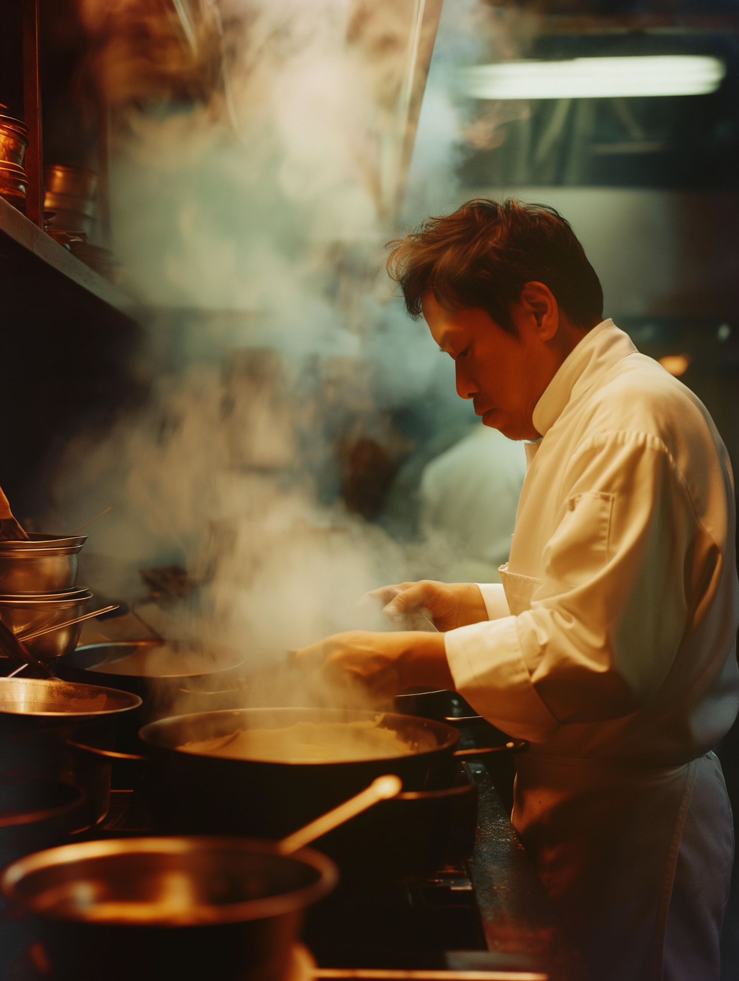 Asian chef in a busy kitchen, focused on cooking with steam rising from pots, creating a warm and dynamic atmosphere.