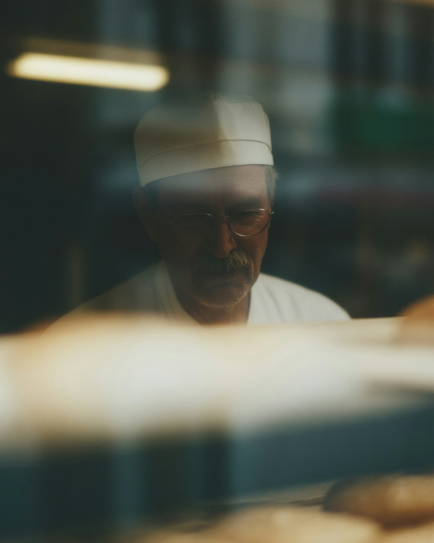 A baker in a white hat and glasses seen through a window, with blurred reflections and pastries in the foreground.