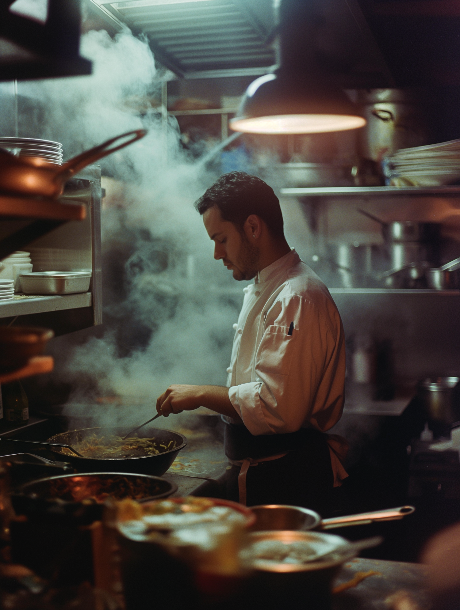 Chef in a dimly lit kitchen, focused on cooking with steam rising, creating an intense and dedicated culinary atmosphere.