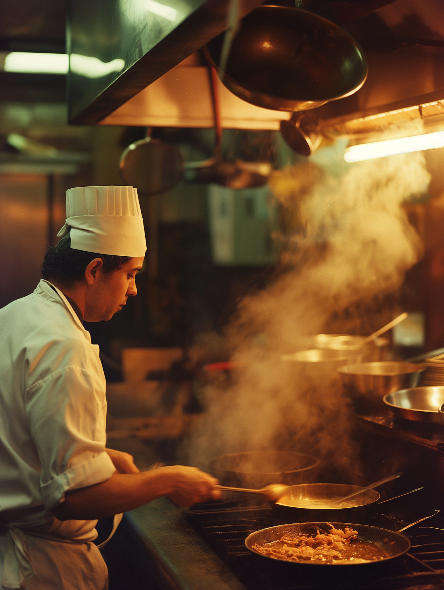 Chef in a dimly lit kitchen cooking with steam rising from a pan, creating a warm and busy atmosphere.