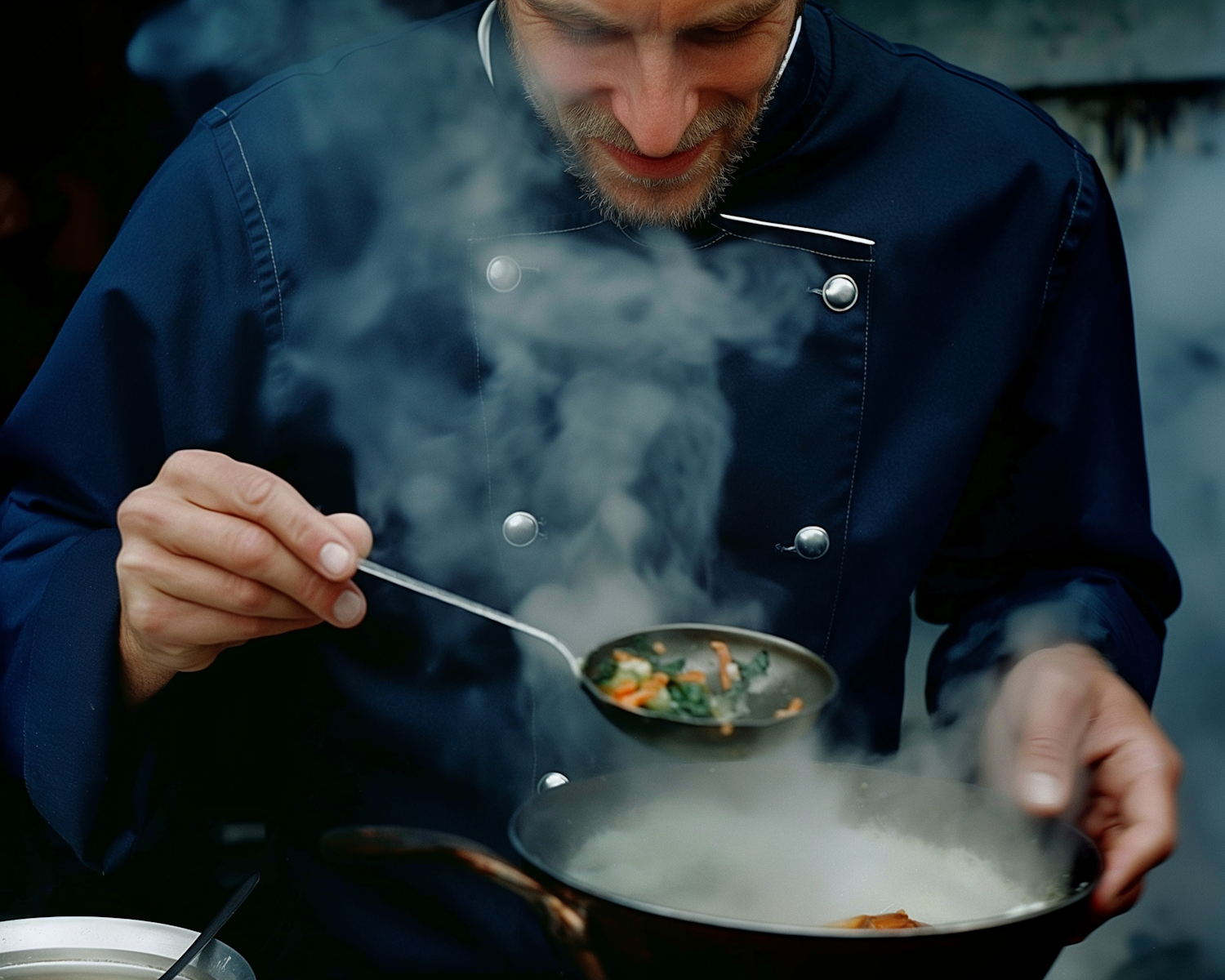 A chef in a blue jacket ladles steaming vegetable soup from a pot, with dramatic steam rising in a dark, moody kitchen setting.
