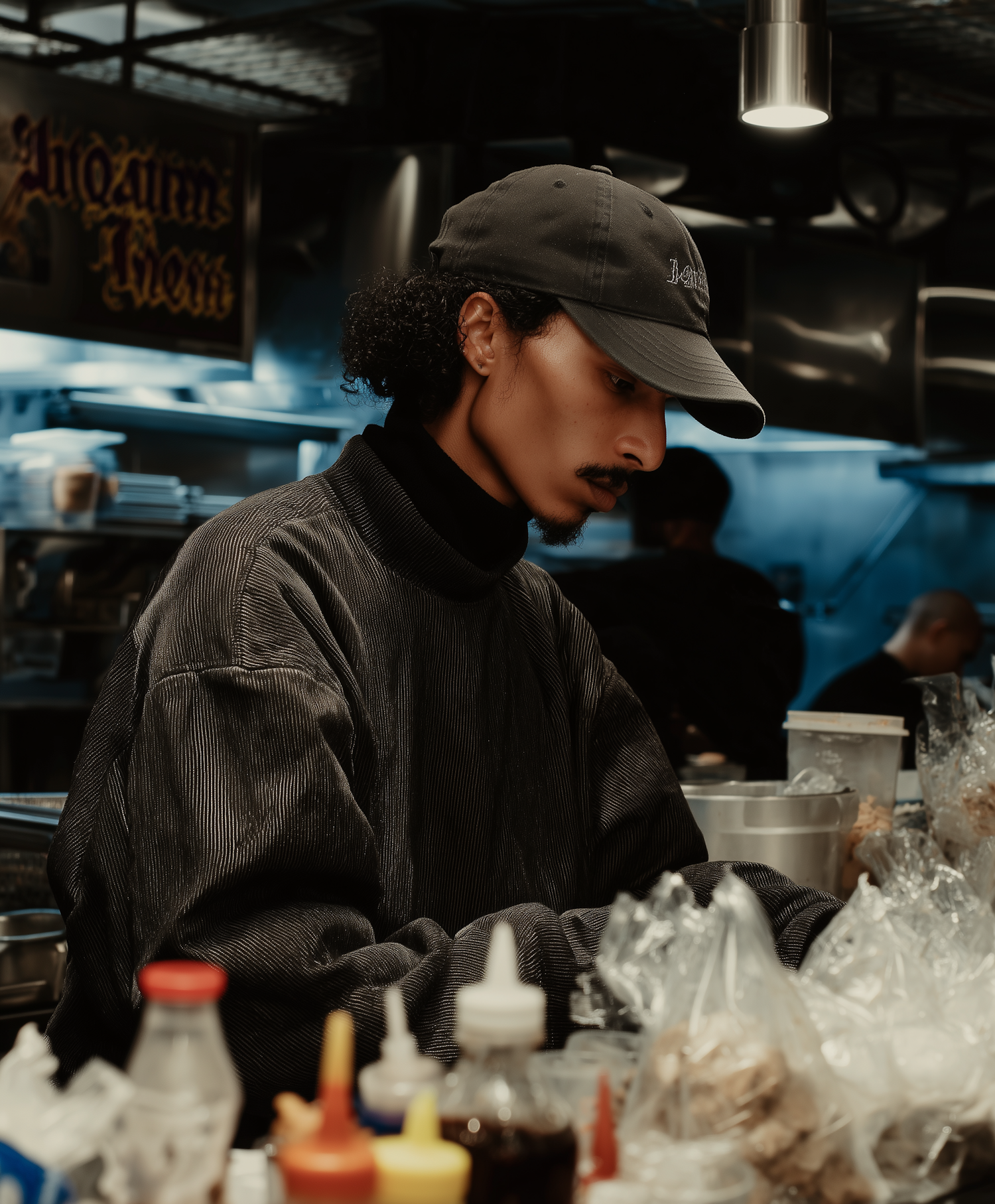 Focused individual working in a professional kitchen with condiments and cooking utensils in use, set in an industrial yet clean ambiance.