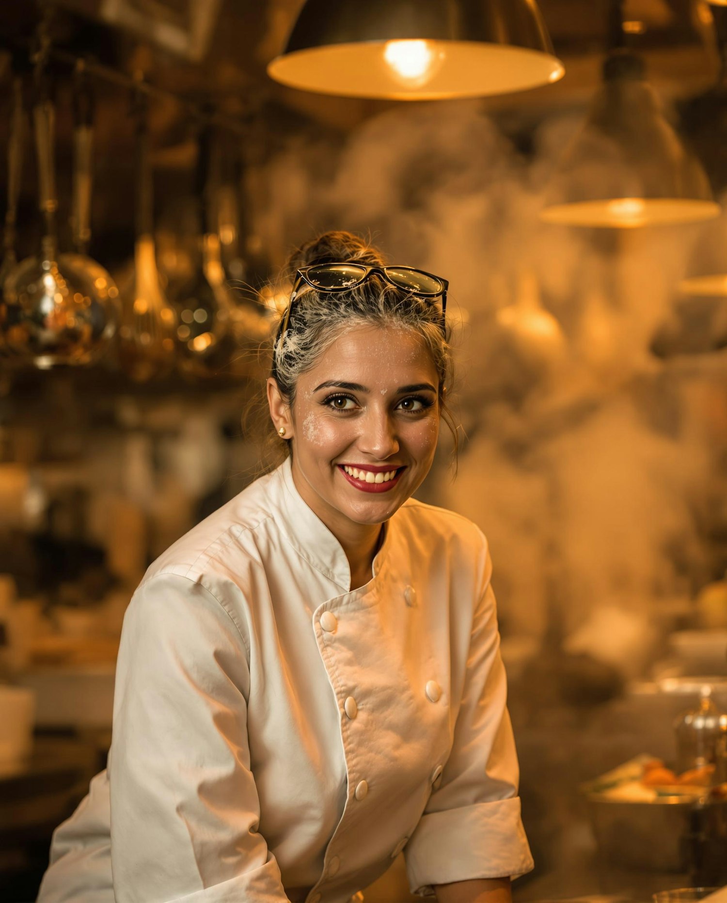 A woman in a white chef's jacket, leaning slightly forward with flour dust on her cheeks and a soft smile. Captured in her restaurant kitchen with warm tungsten lights. Shot with a shallow depth of field; background slightly motion-blurred with steam and hanging utensils. Color tones warm and golden, with high texture clarity.