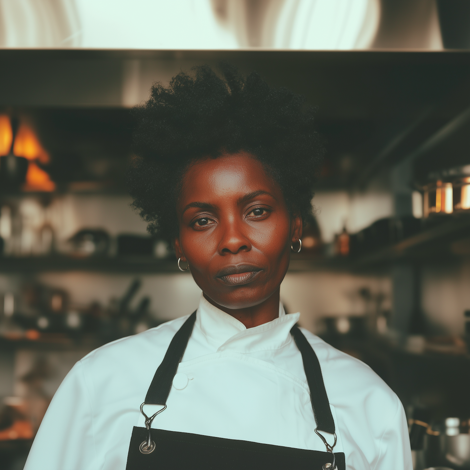 Portrait of a chef with natural hair wearing a white jacket and black apron in a kitchen with warm lighting.