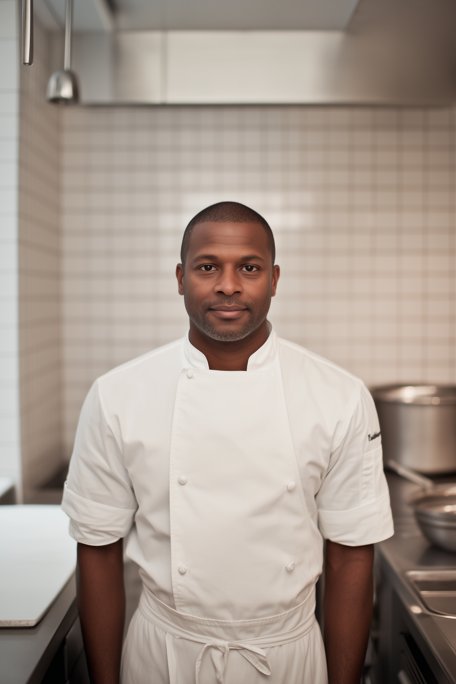 Black chef in a white uniform stands confidently in a professional kitchen with tiled walls and stainless steel equipment.