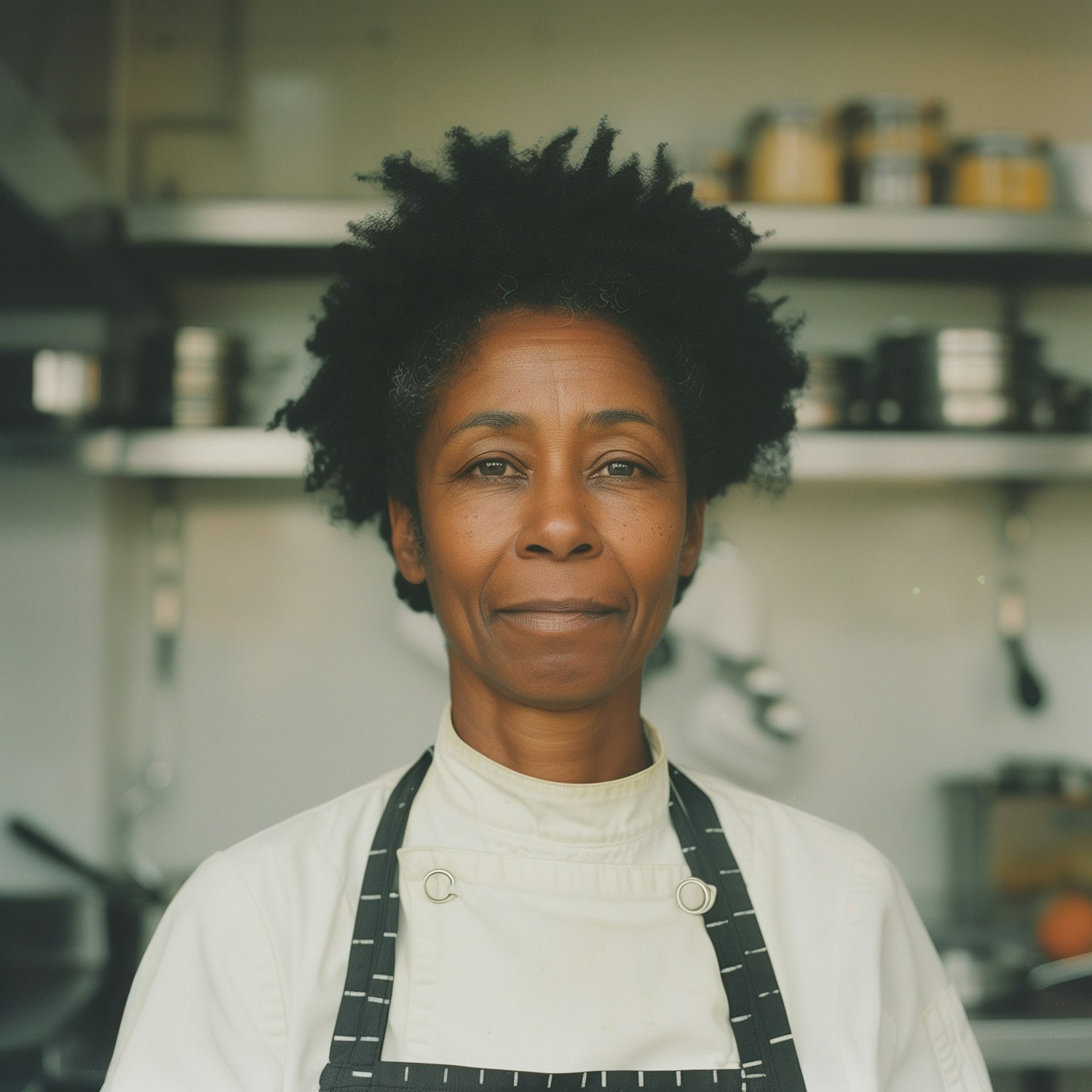 A chef in a white jacket and apron stands in a professional kitchen, exuding expertise. Pots and utensils adorn the softly blurred background.