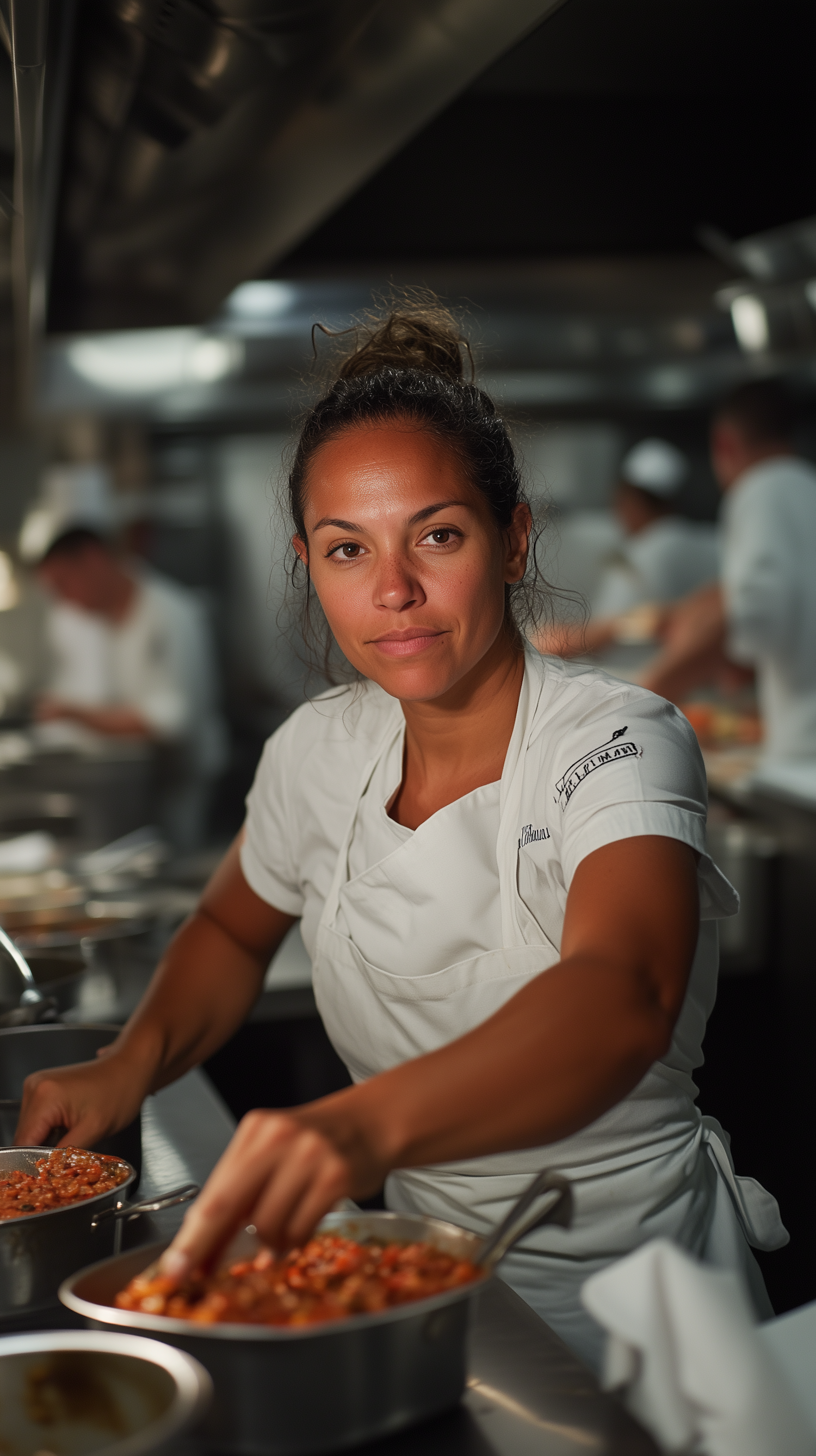 Female chef in a busy kitchen, focused on preparing a dish, wearing a white uniform. Professional culinary environment.
