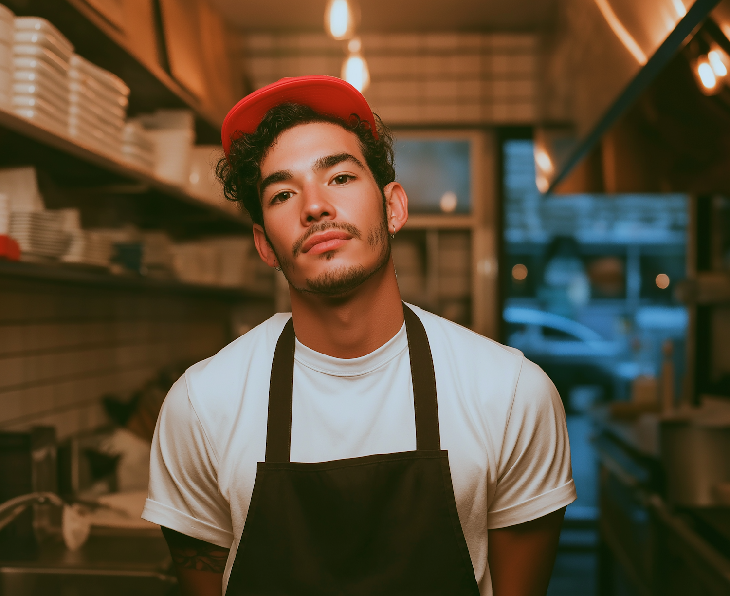 A young man in a professional kitchen wearing a red cap, white t-shirt, and black apron, with warm lighting setting the tone.