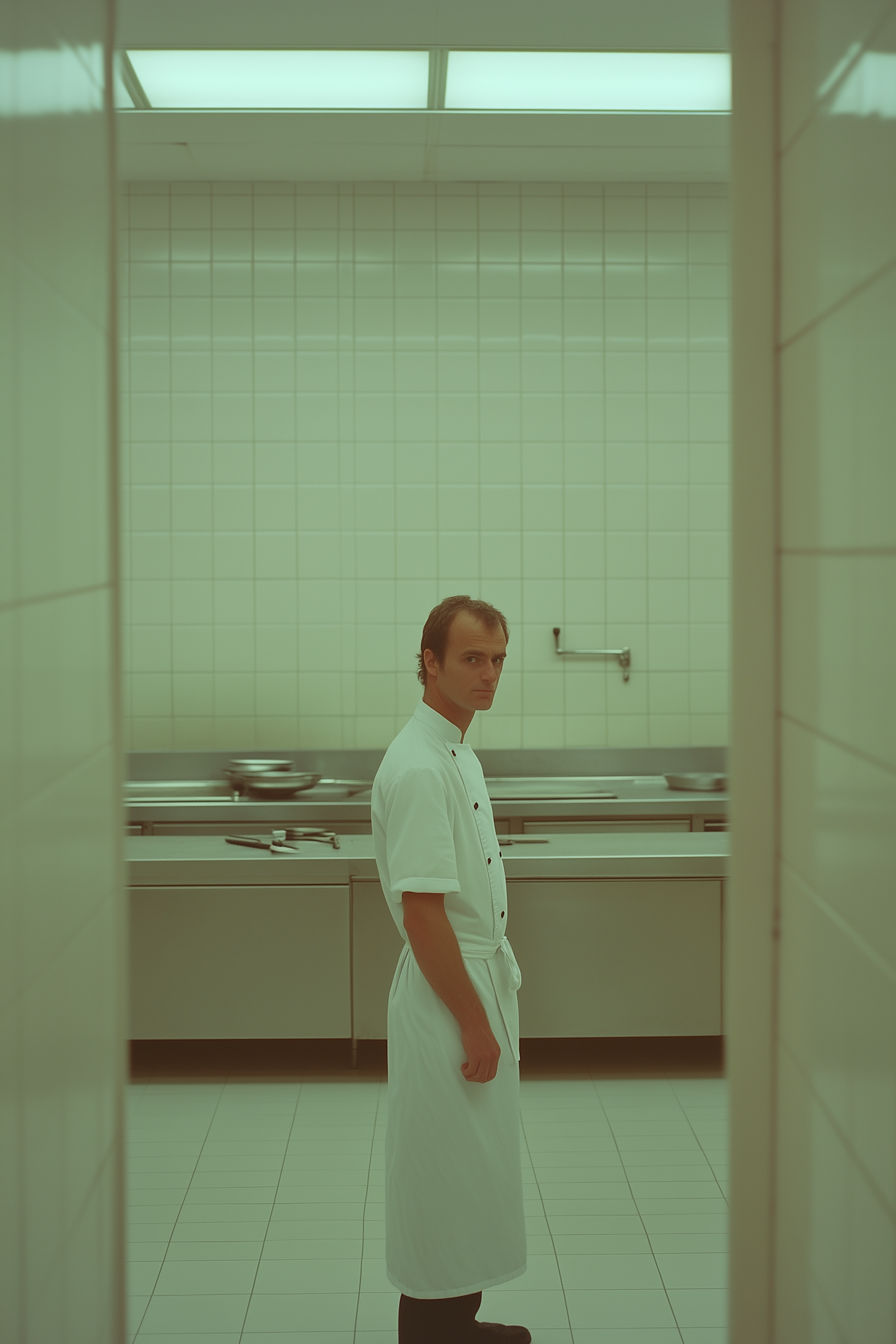 Chef in a pristine kitchen with white tiles and stainless steel counters, exuding a calm and professional vibe.