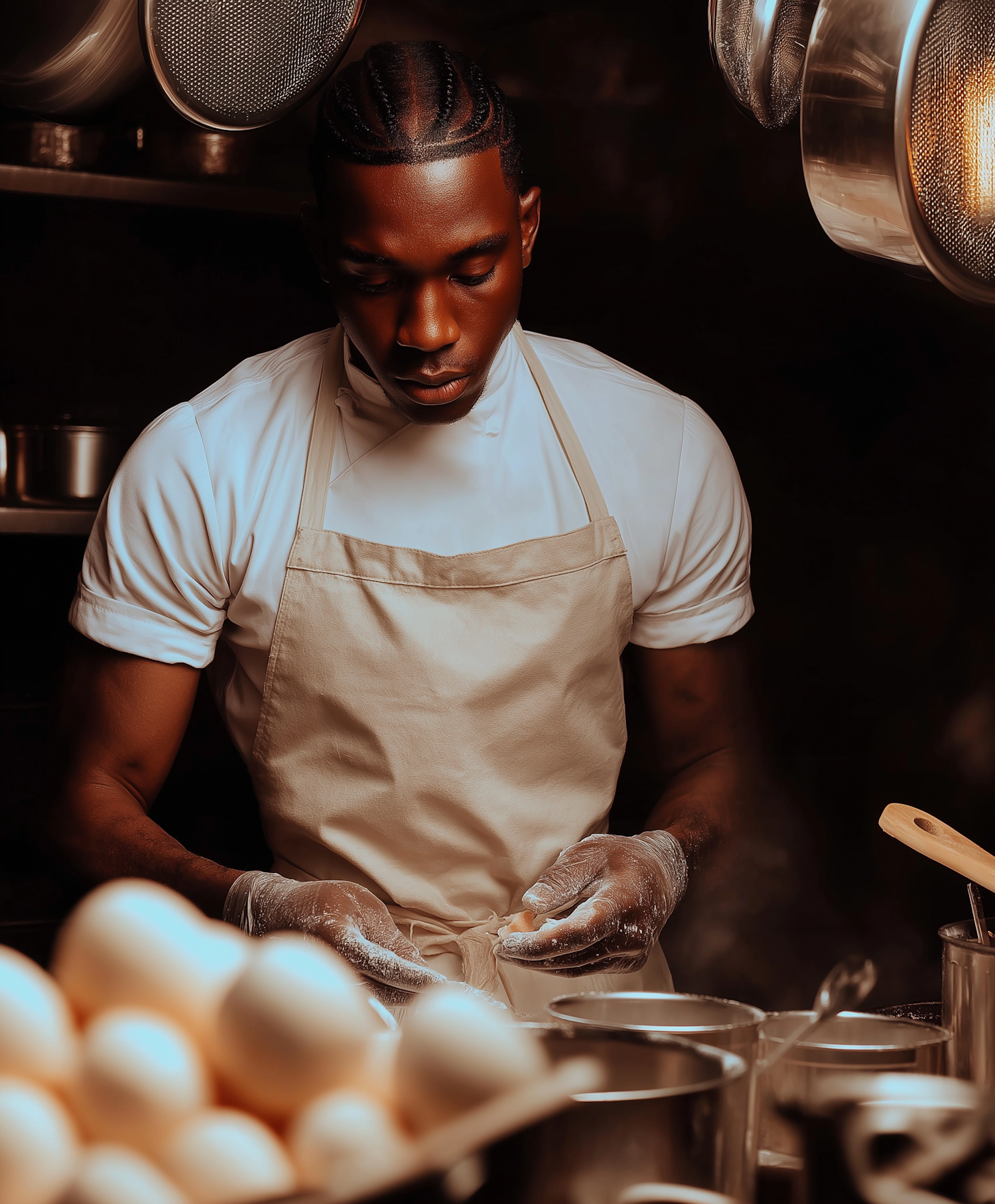 Focused chef preparing dough with precise care in a warmly-lit kitchen, utensils and ingredients adding to the artisanal vibe.